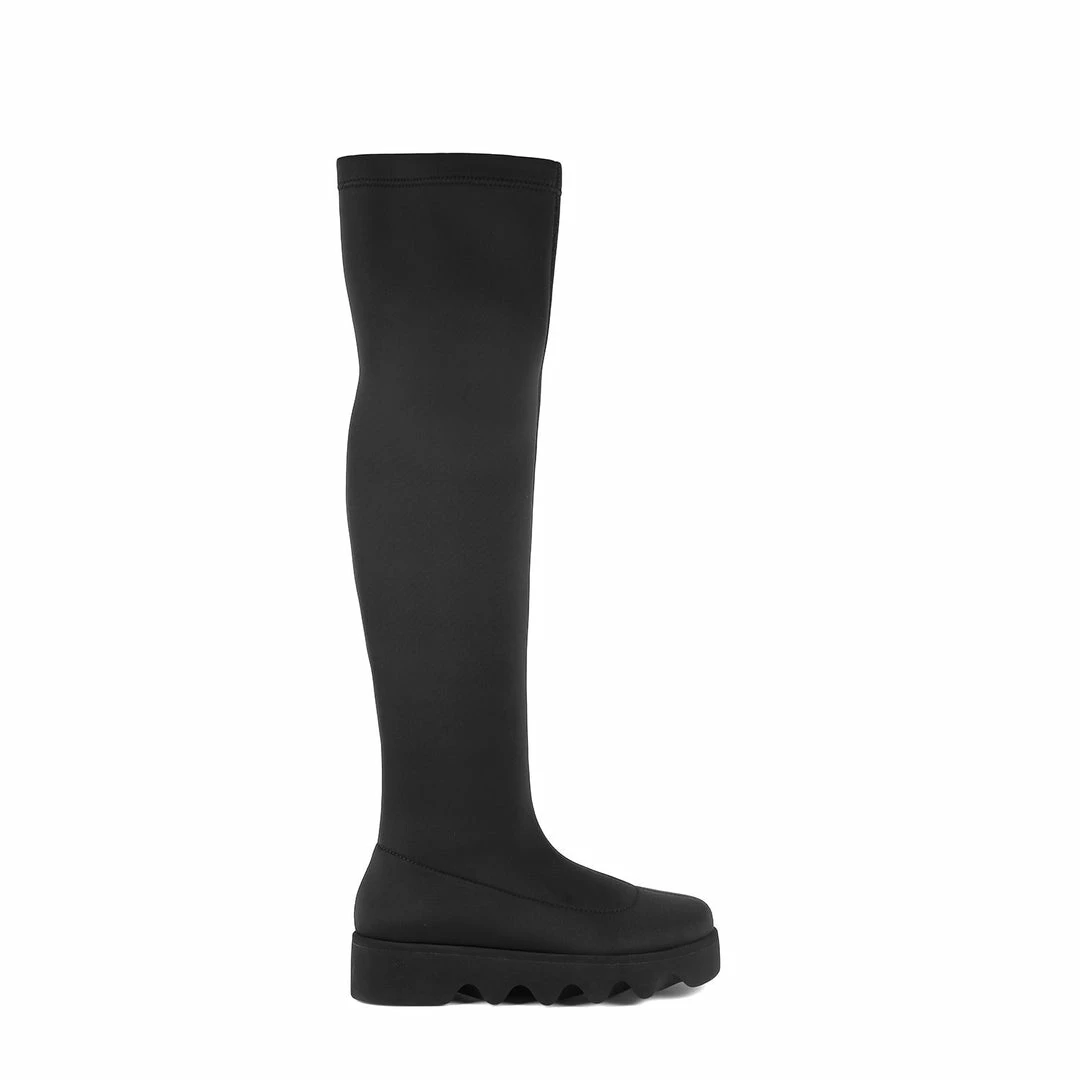 The Bounce Long Boot is a pull on boot fabricated with neoprene and grounded by a chunky, undulating sole.