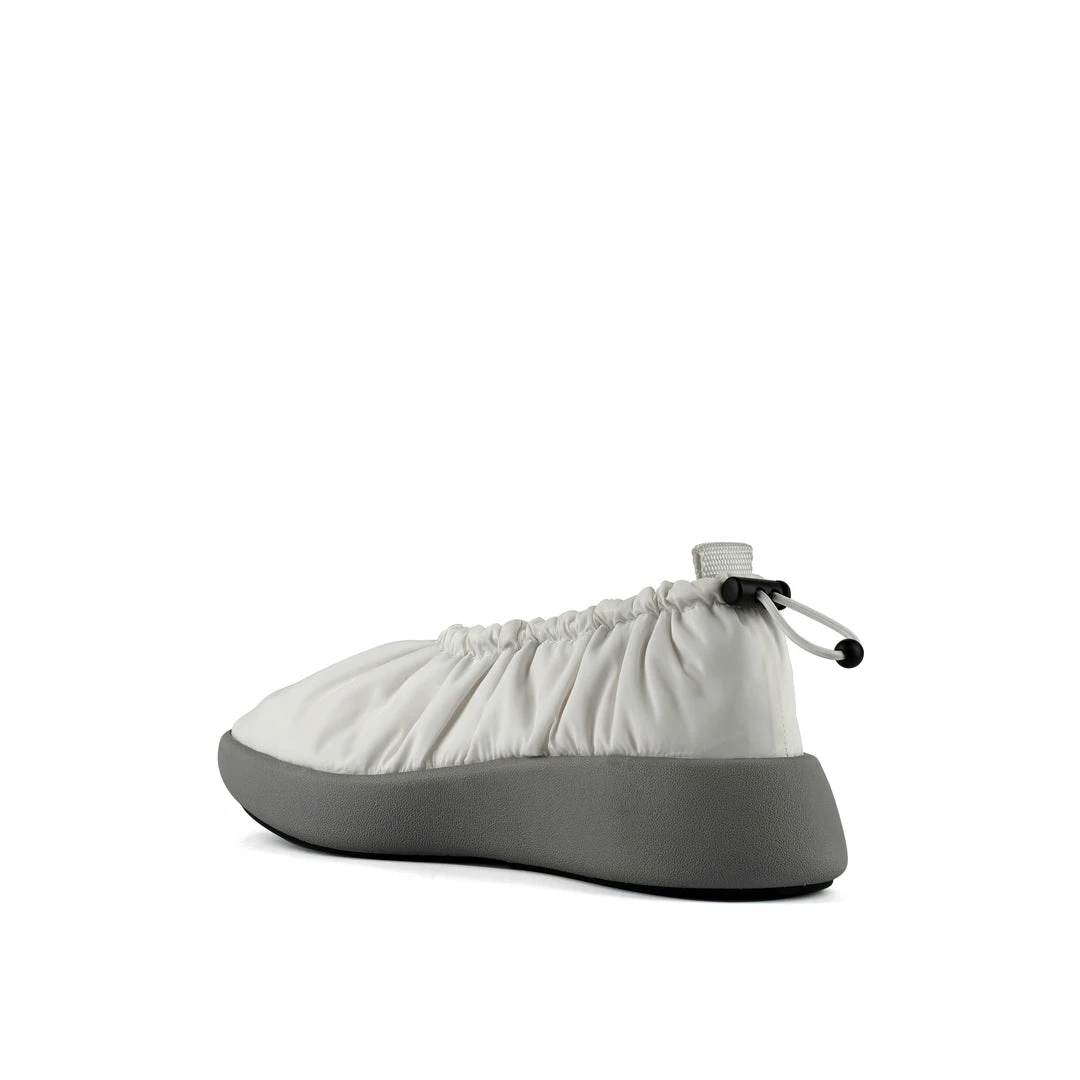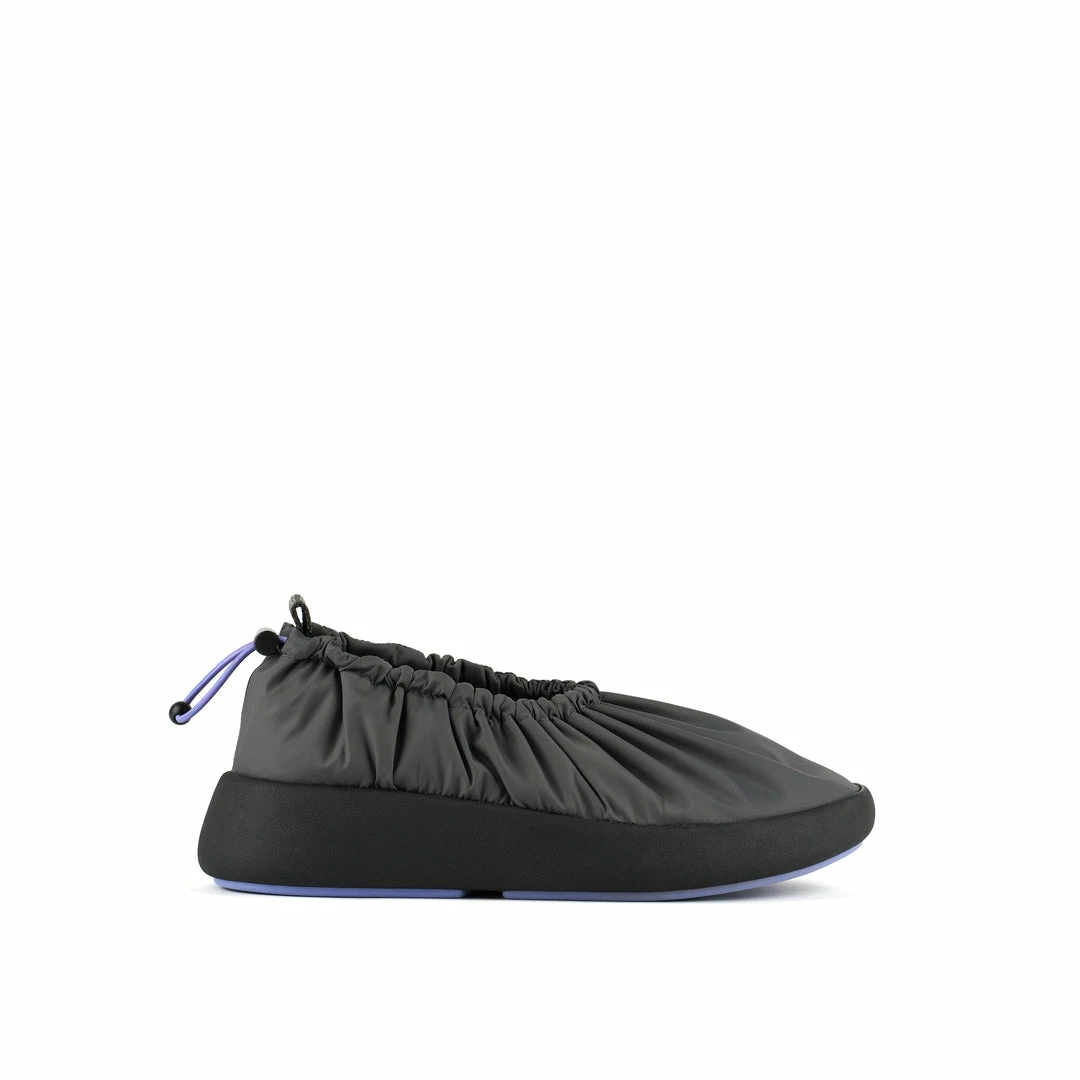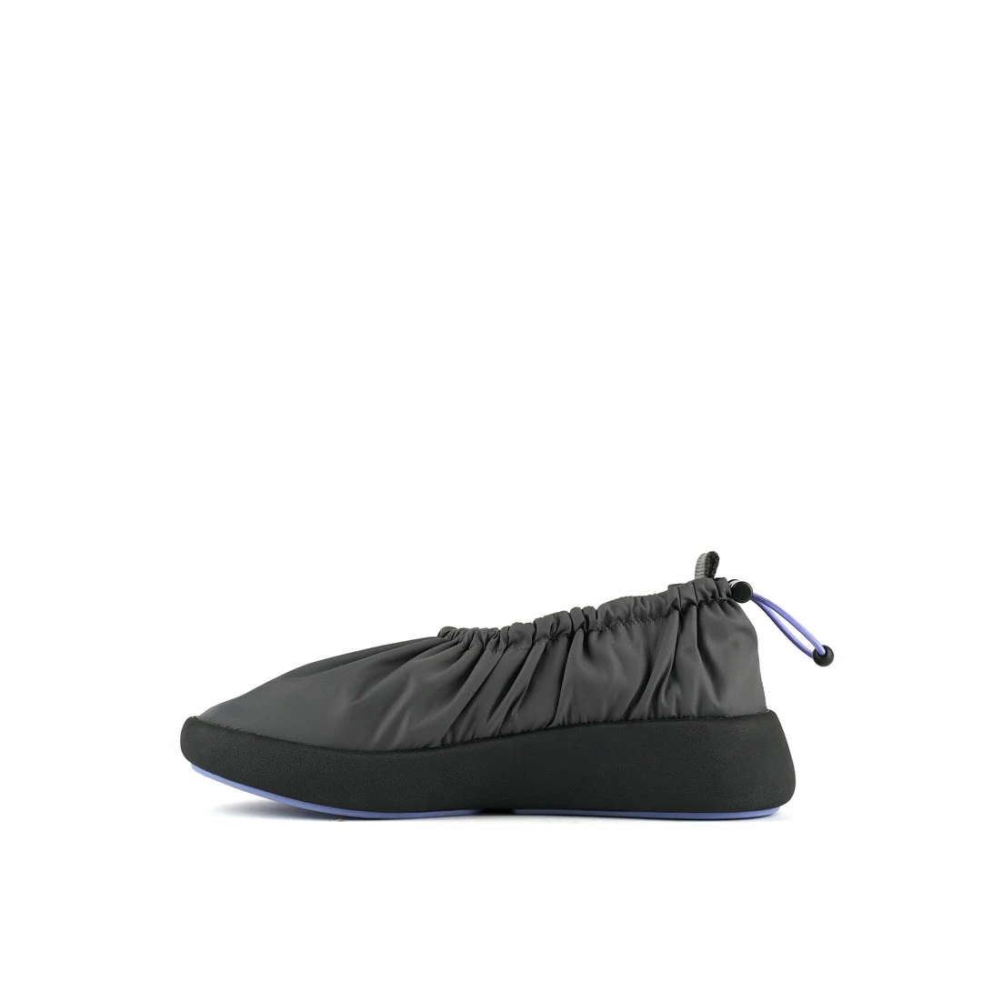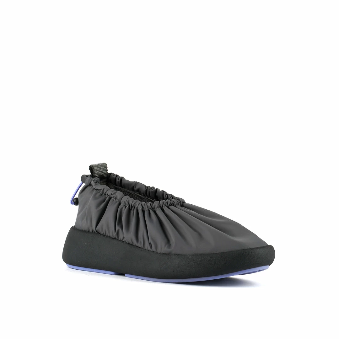 The IMxUN Cover is a round toe slip on sneaker with a nylon fabric upper, a lightweight EVA rubber outsole, and a pull tab at the heel. It features a ruched topline and an adjustable drawstring toggle.