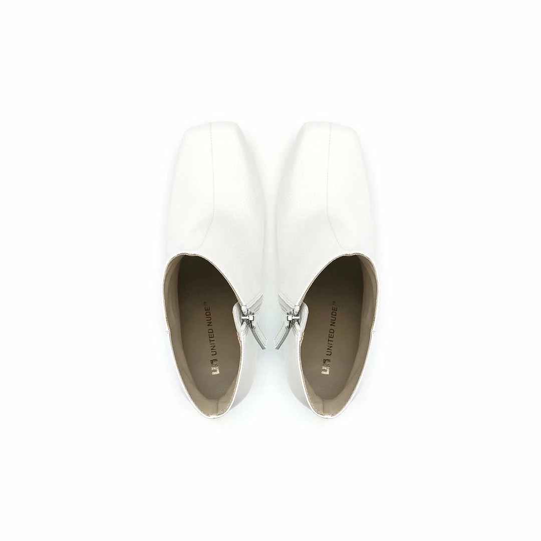 The Cube Boxy Hi is a high heel, square toe ankle boot grounded by a geometric block heel. A thin metallic structure extends from the shank to bisect the heel, giving a gravity defying illusion.