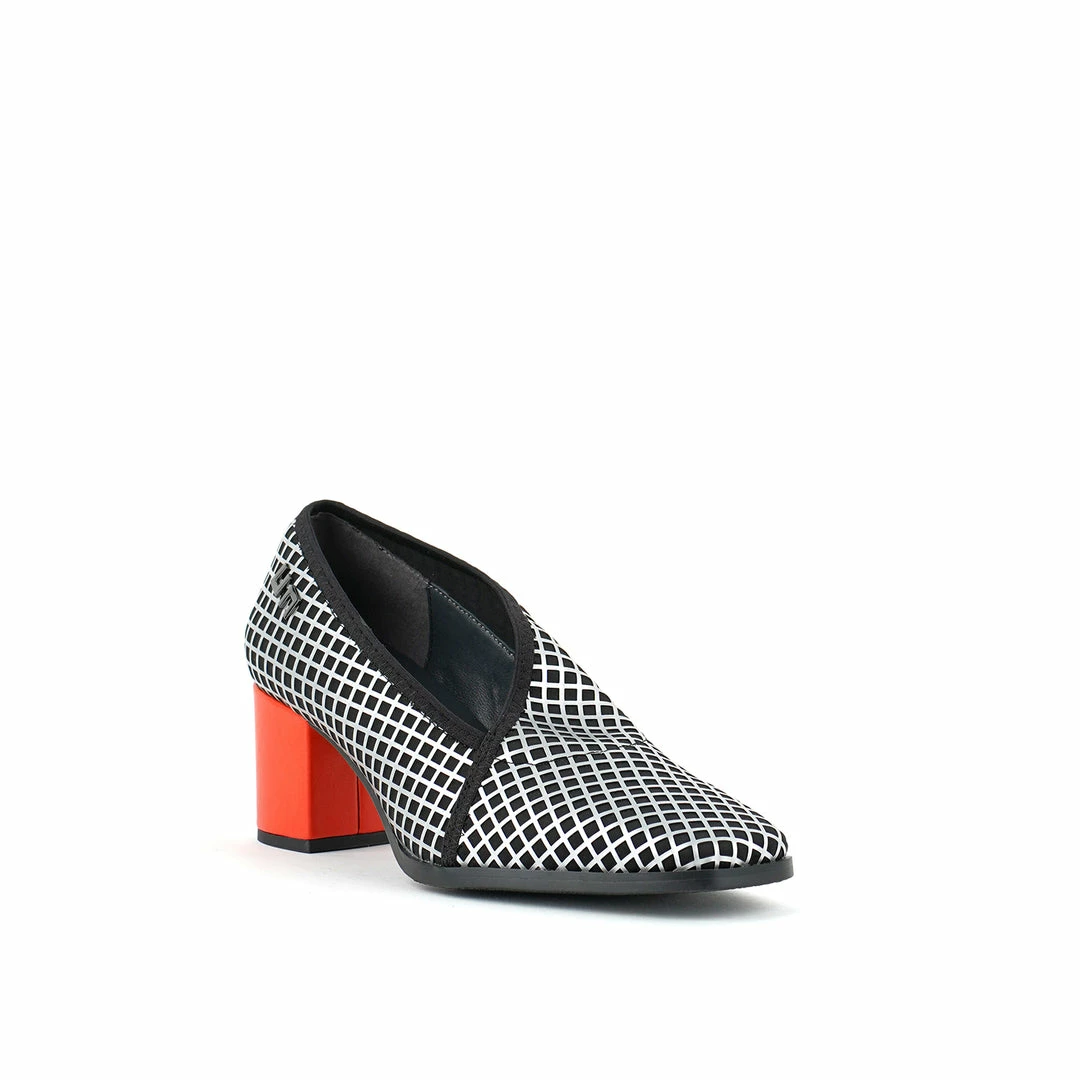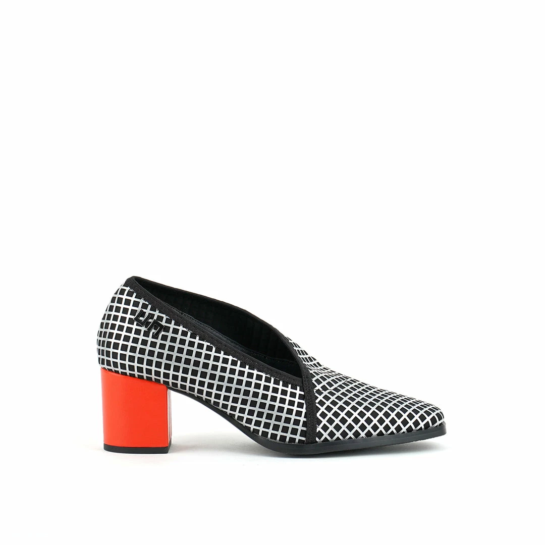 The Fold Stella Mid is an easy slip-on style with a soft square toe and an asymmetric design on a block heel. This style is the ultimate combination of comfort and smart design, using elasticized fabric and monochromatic embroidery for a modern design.