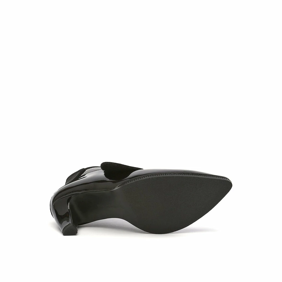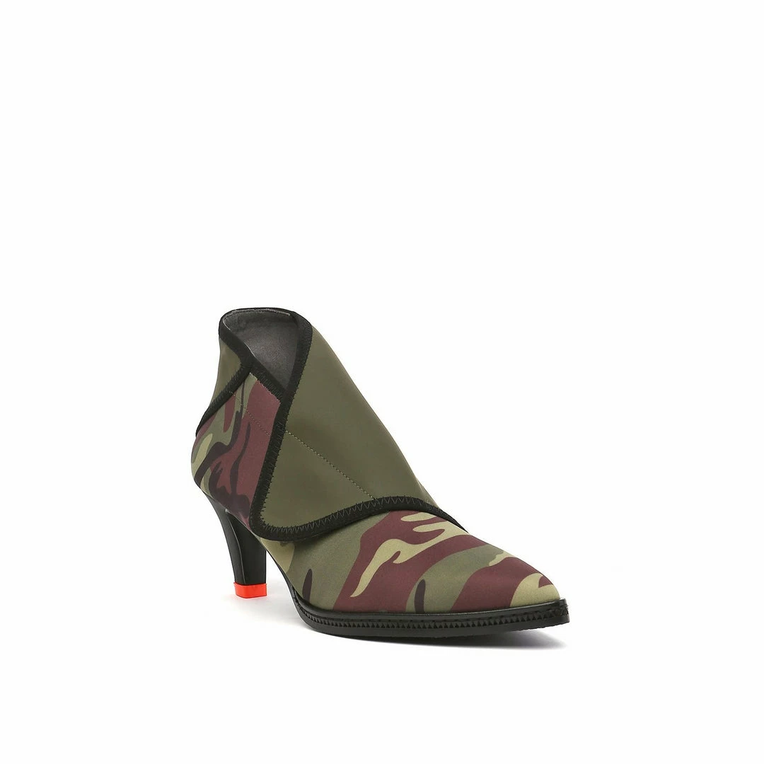 The Furrow Mid is a pointed toe mid heel. Piped neoprene wraps around the polyurethane upper to create an asymmetrical top line.