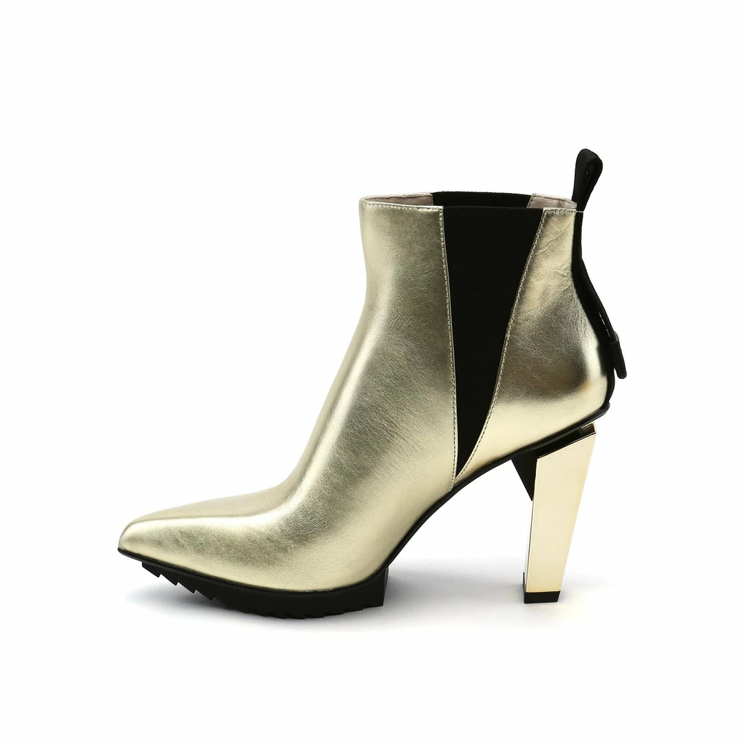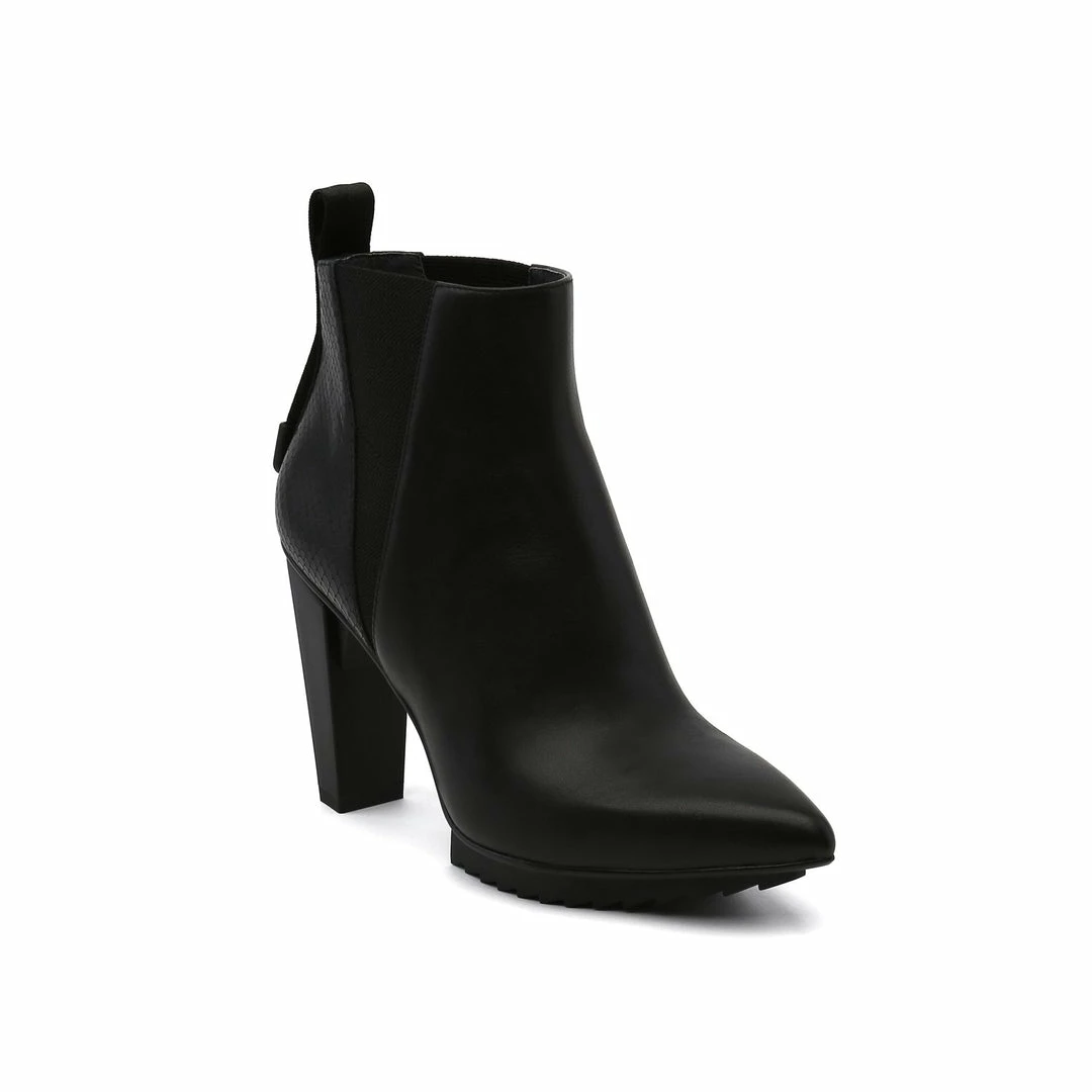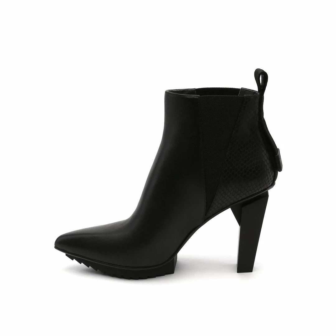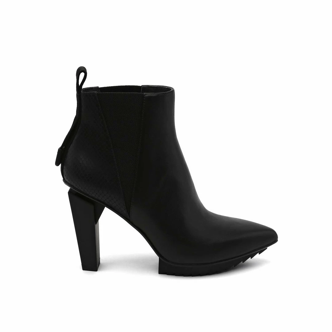 The LEV Tek Bootie Hi is a pointy-toe high heel that is lifted by an angular high heel and cleated rubber platform. Rear pull straps and a triangular elastic panel fortify the style while adding functionality.