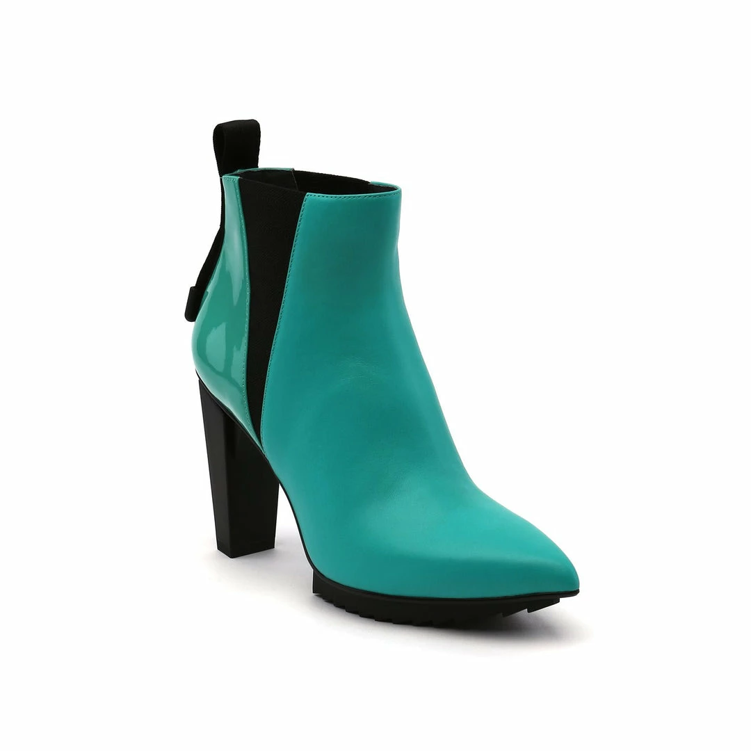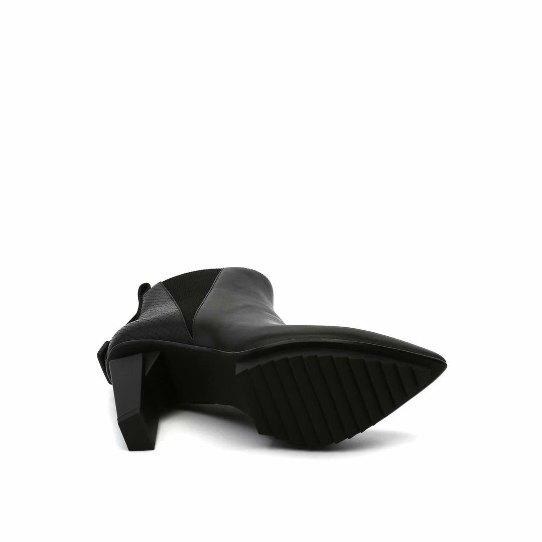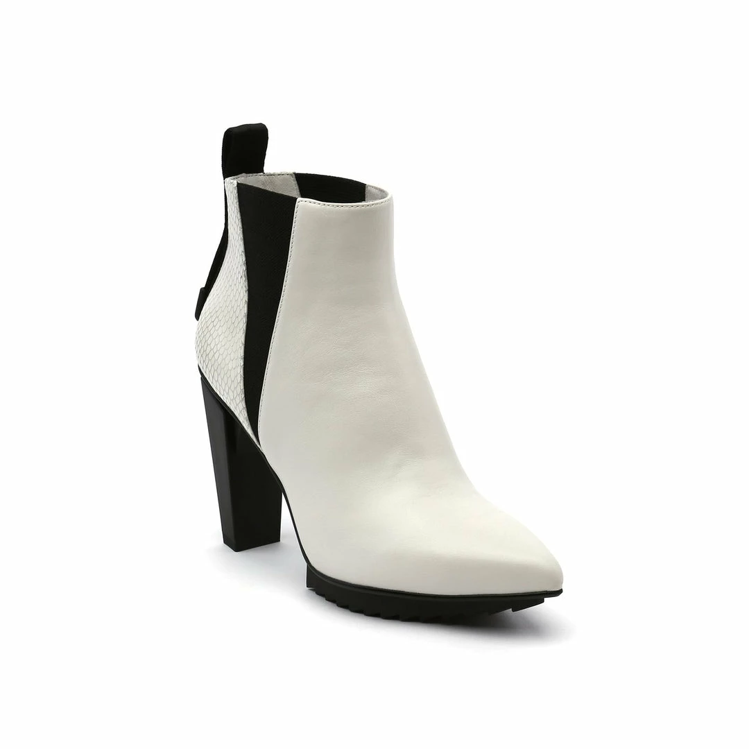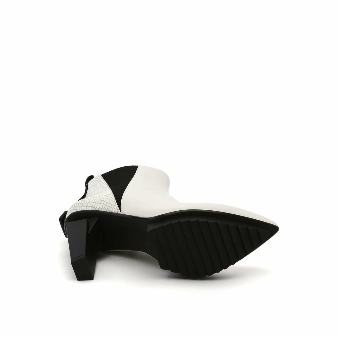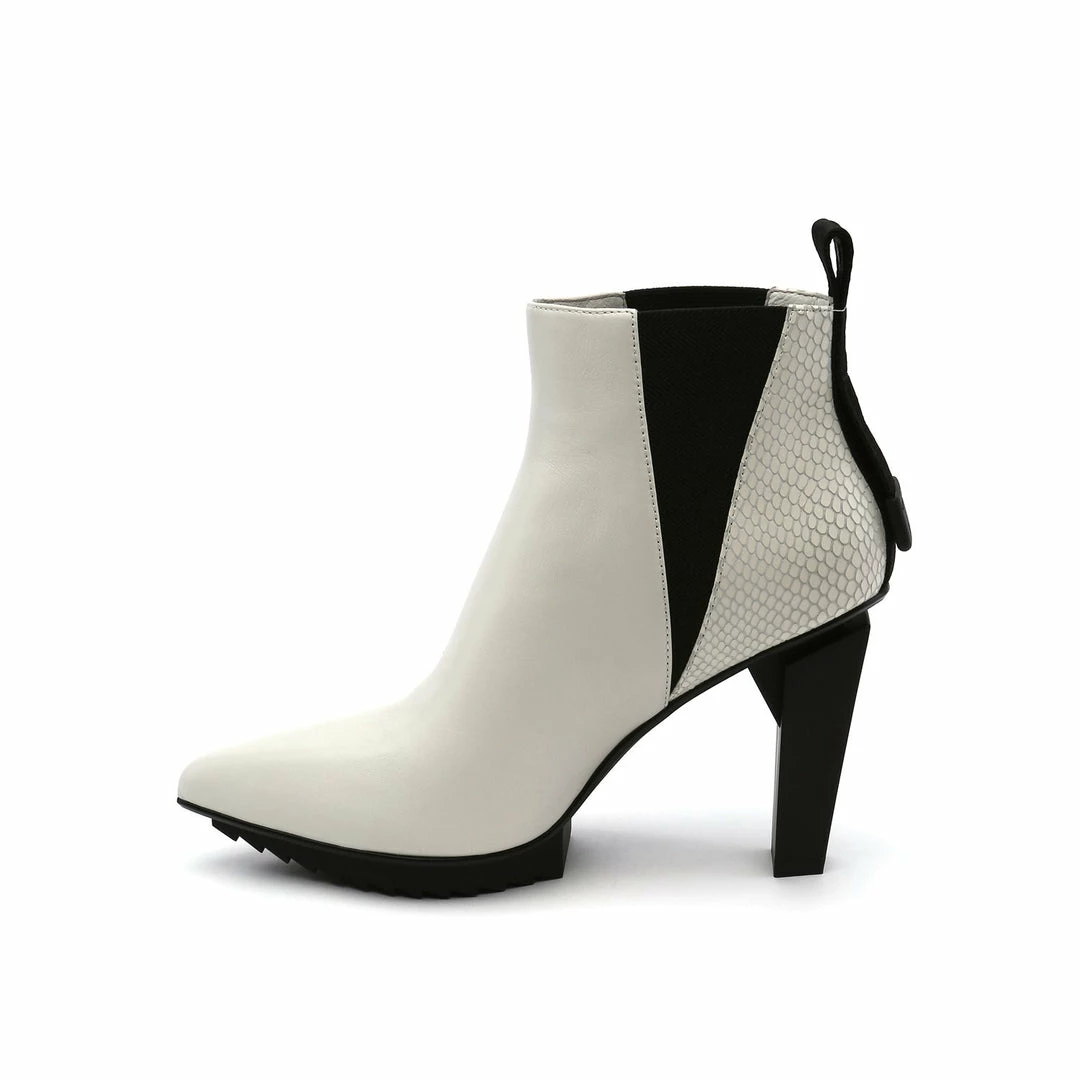 The LEV Tek Bootie Hi is a pointy-toe high heel that is lifted by an angular high heel and cleated rubber platform. Rear pull straps and a triangular elastic panel fortify the style while adding functionality.