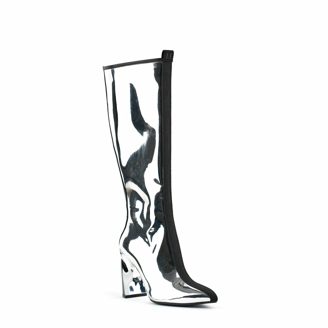 The Lucid Molten Hi is a futuristic silhouette offering a knee-high boot on-top United Nude’s signature Molten heel. A rear zip and pull tab offer easy entrance and comfort, whilst still making a statement.