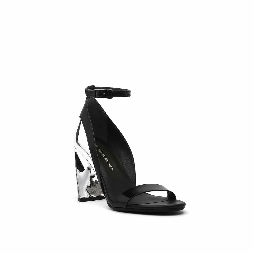 The Molten Flow Sandal Hi is an elegant two strap high heel set on a slim, yet robust heel. The metallic silhouette gives the impression of liquid metal being gracefully poured over the shoe.