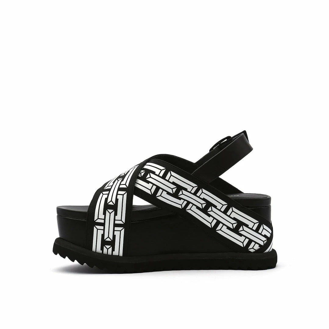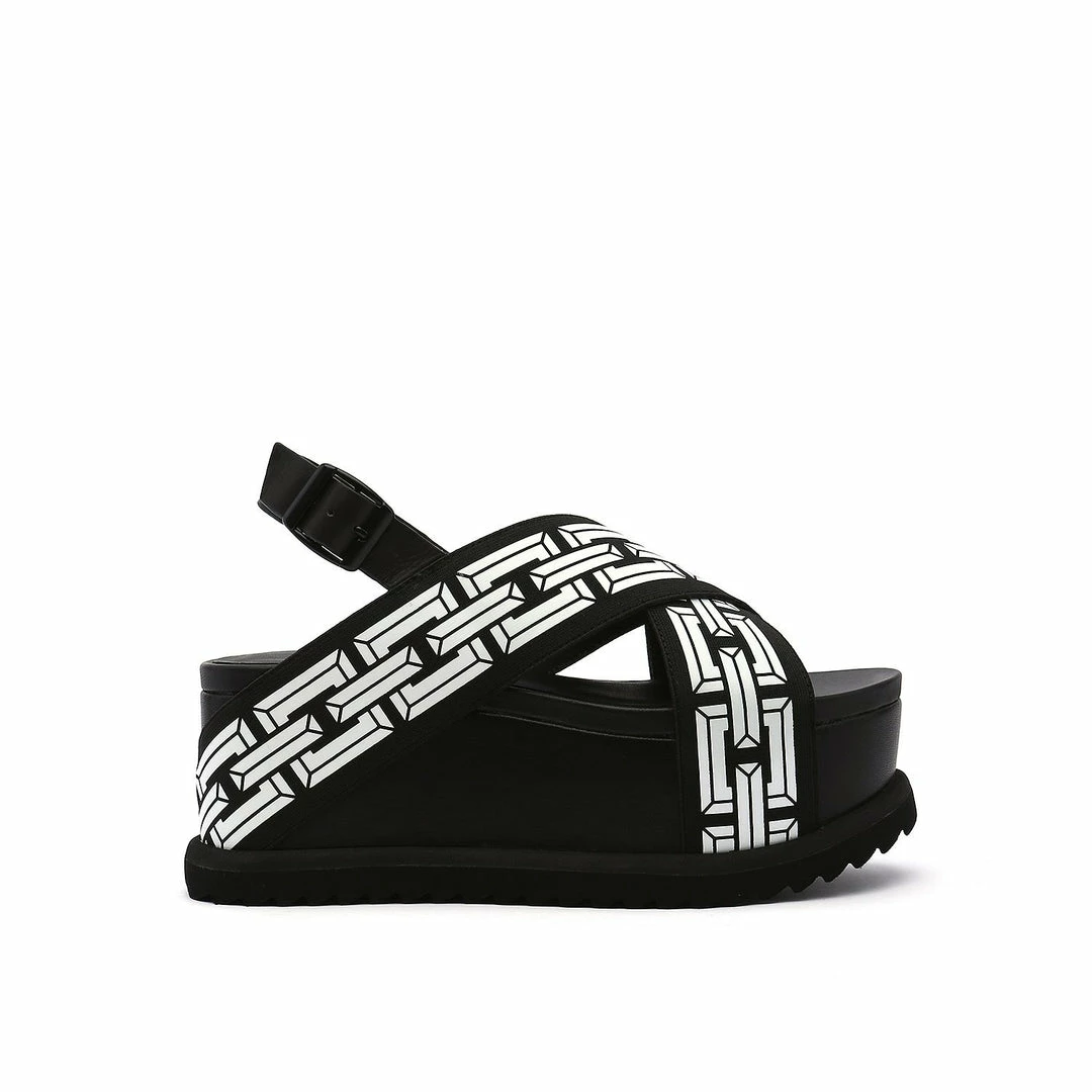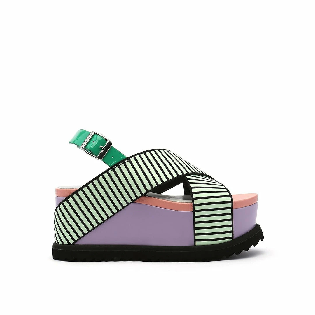 The Pop Cross Wedge is a flatform sandal with graphic criss cross straps anchored by a toothy serrated rubber sole.