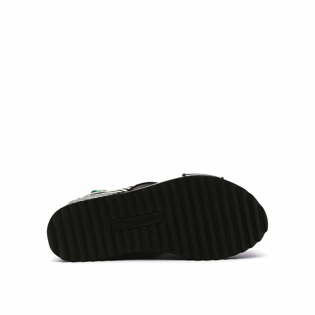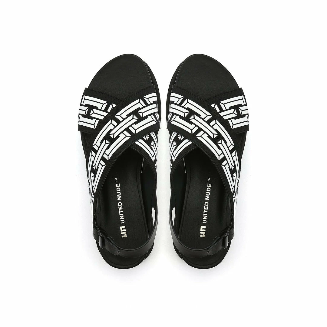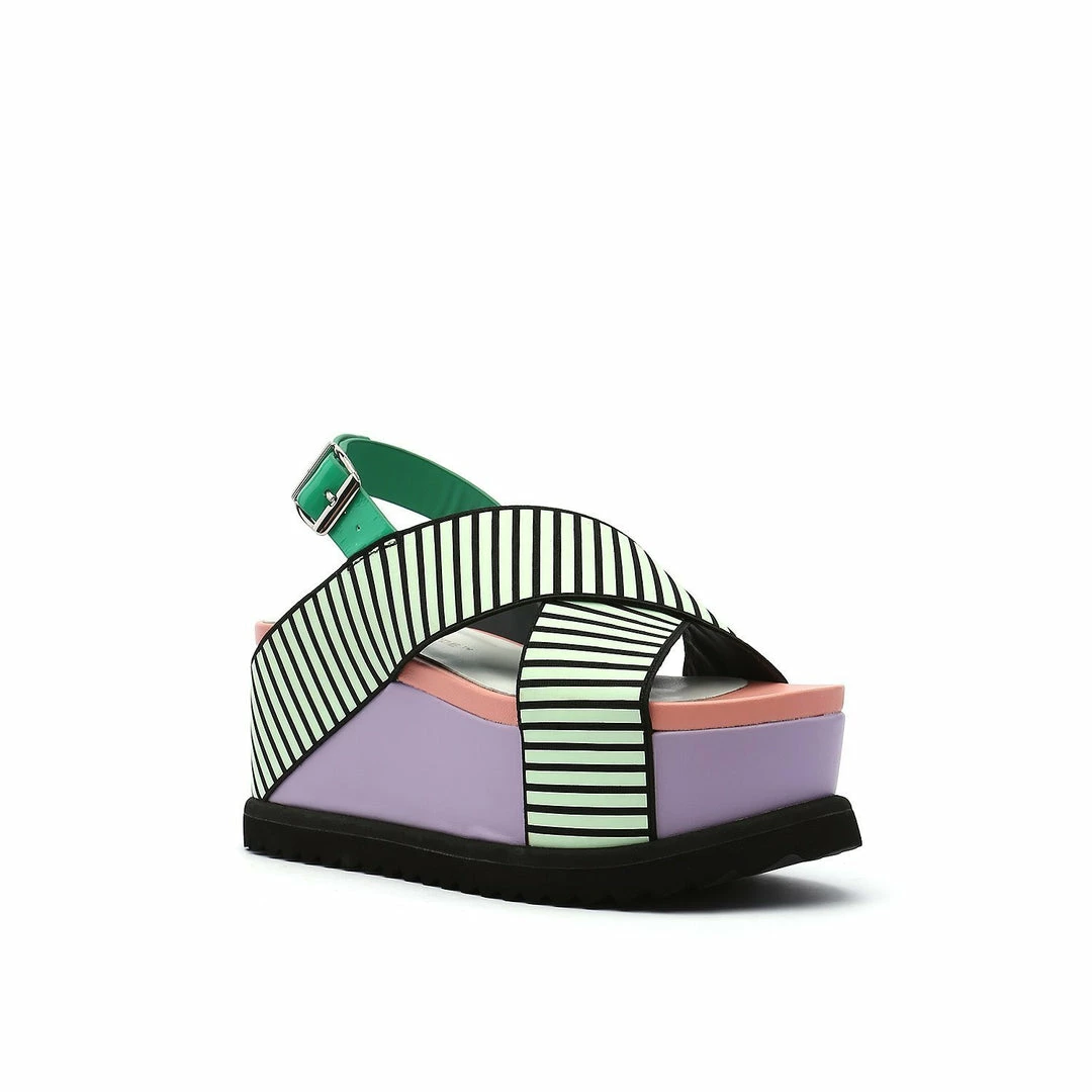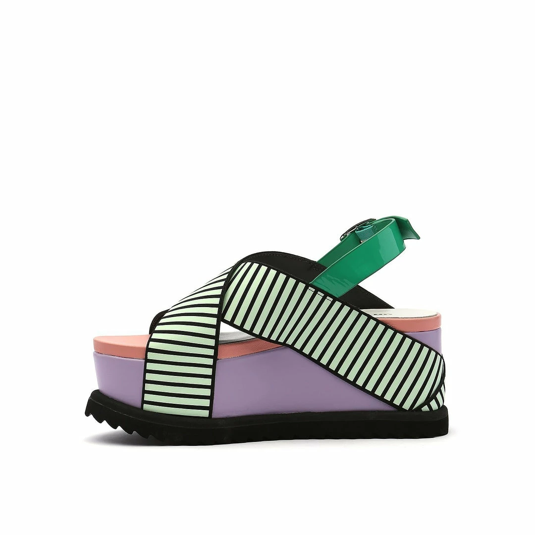 The Pop Cross Wedge is a flatform sandal with graphic criss cross straps anchored by a toothy serrated rubber sole.