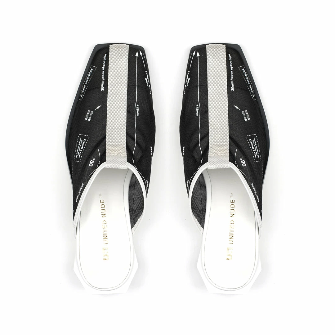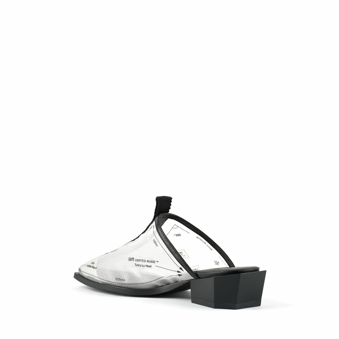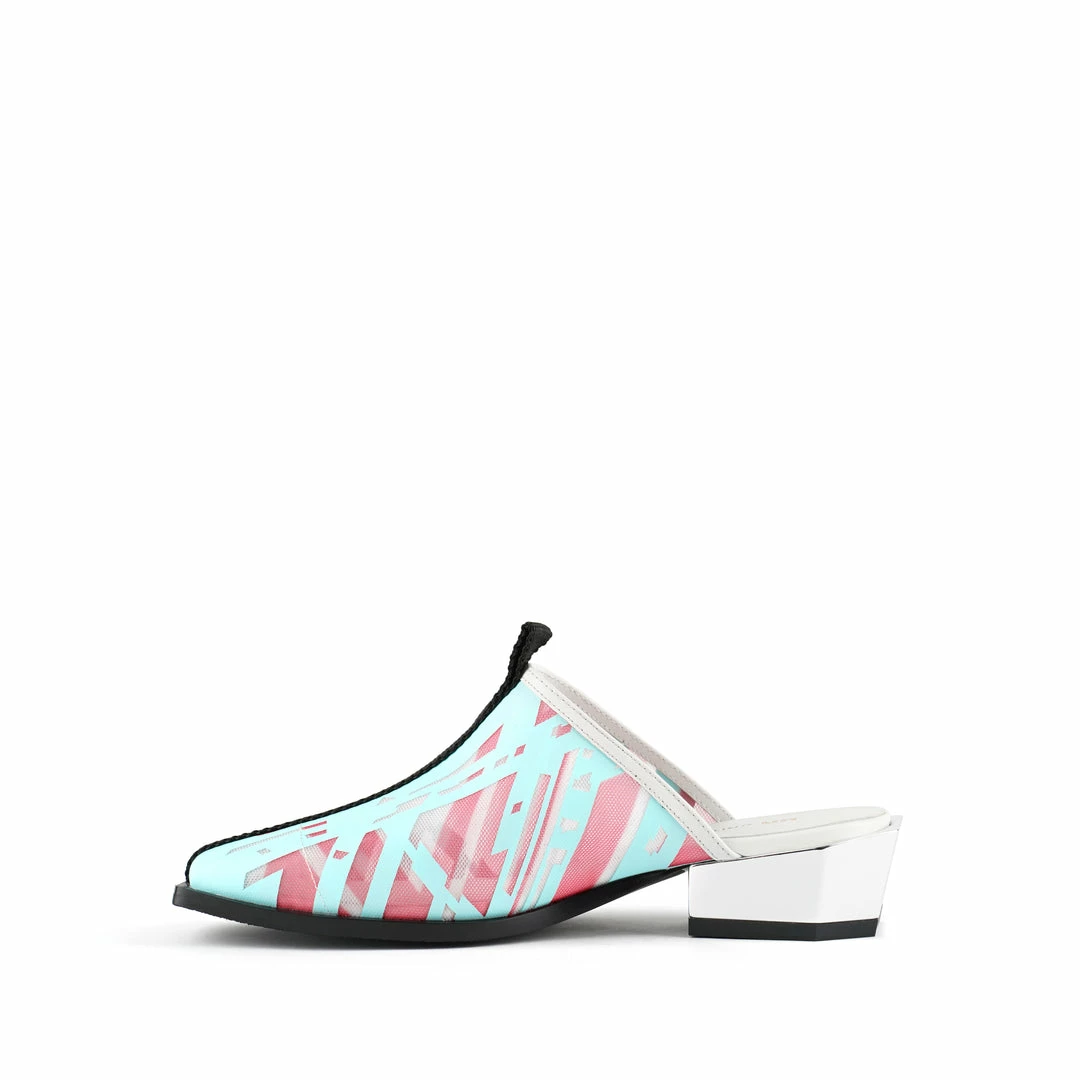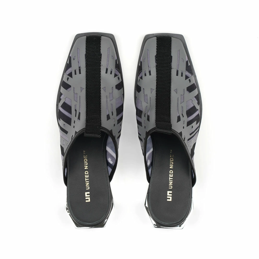 The Rasa Mule is a slip on mule that is lifted by a low geometric block heel. The transparent mesh upper is trimmed with leather and accented with a nylon strip. The heat pressed graphics and striking color breaks are inspired by a series of mixed media paintings by United Nude founder and creative director Rem D. Koolhaas.