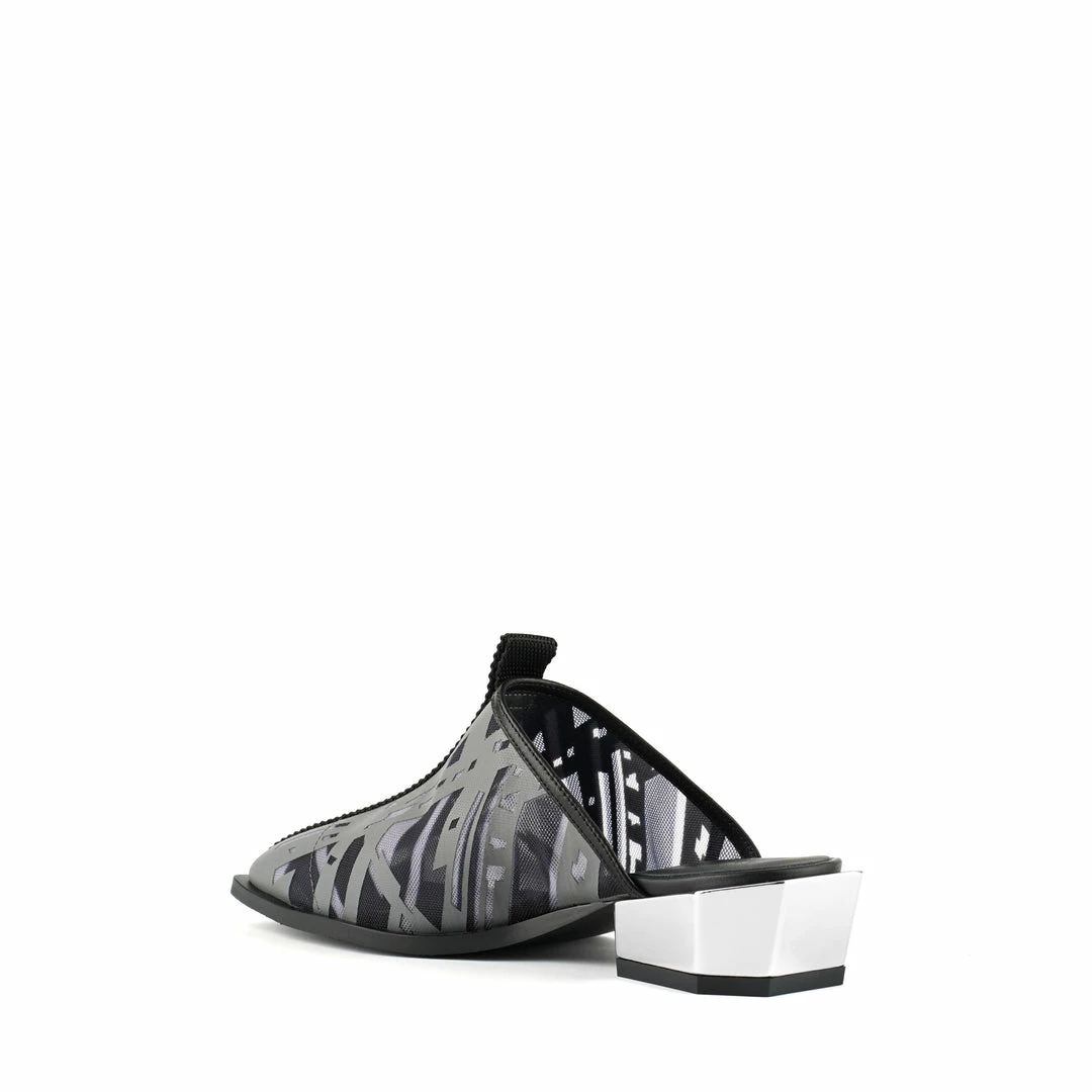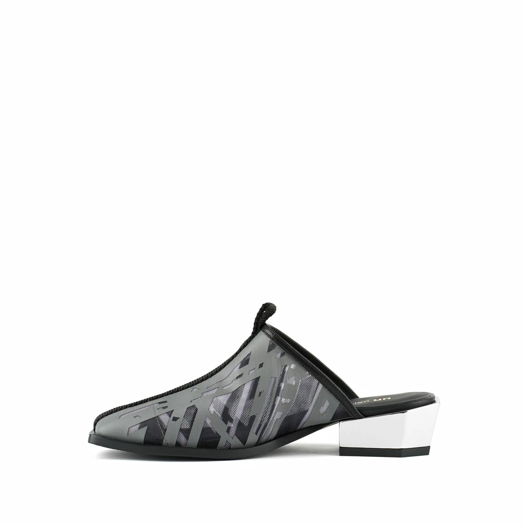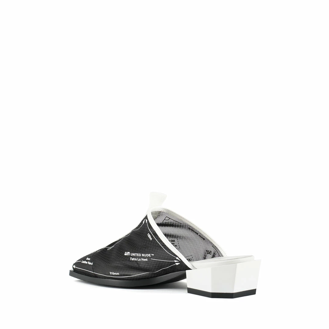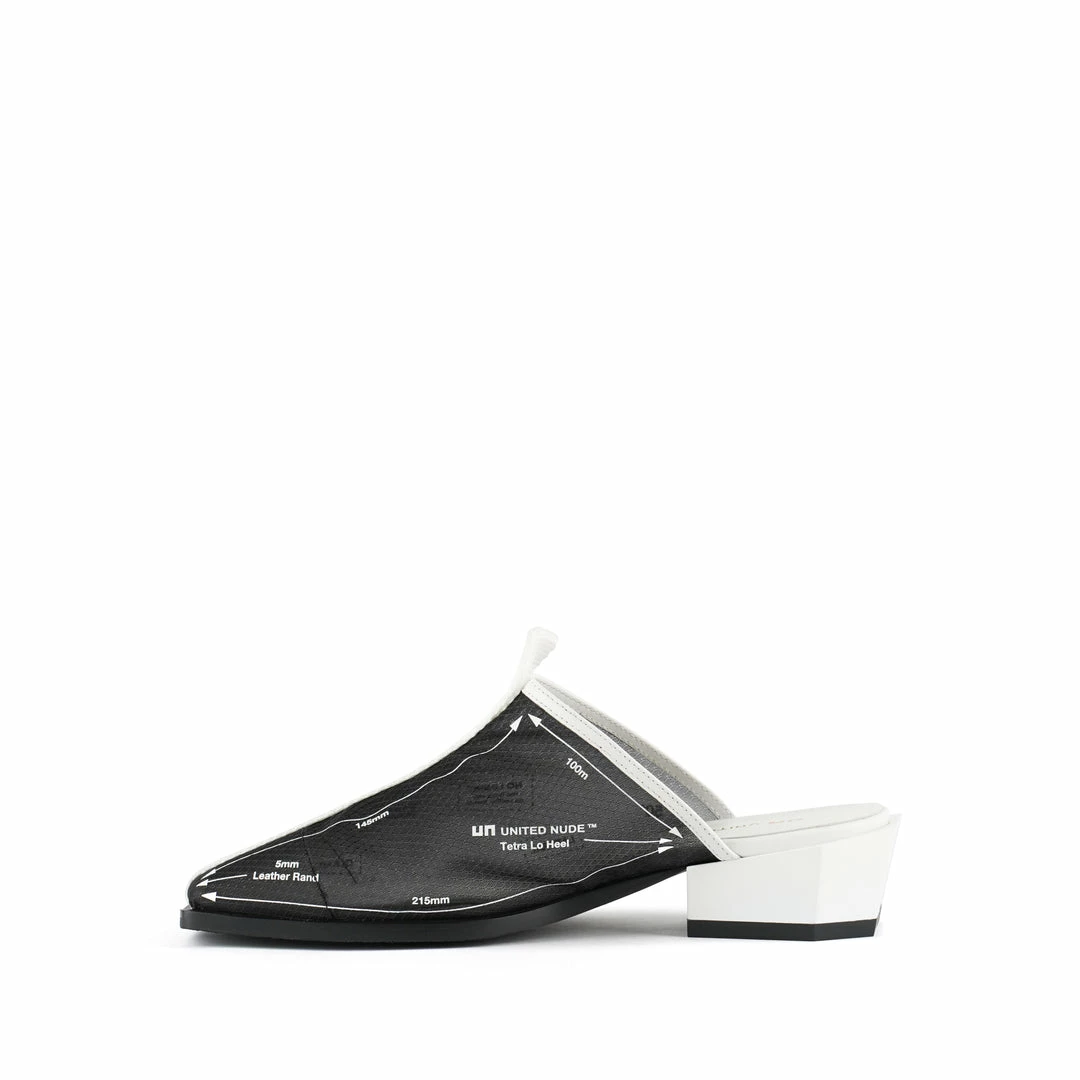 The Rasa Mule is a slip on mule that is lifted by a low geometric block heel. The transparent mesh upper is trimmed with leather and accented with a nylon strip. The heat pressed graphics and striking color breaks are inspired by a series of mixed media paintings by United Nude founder and creative director Rem D. Koolhaas.