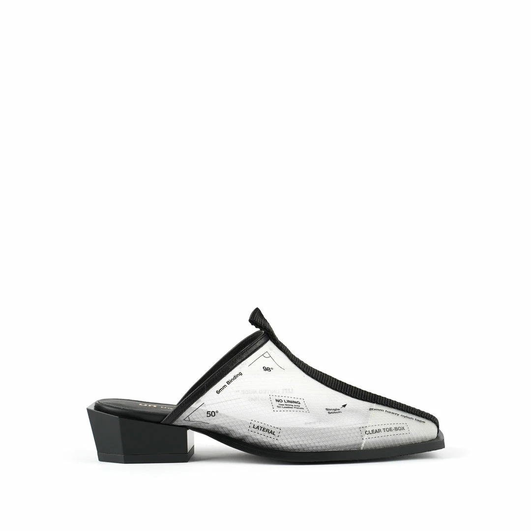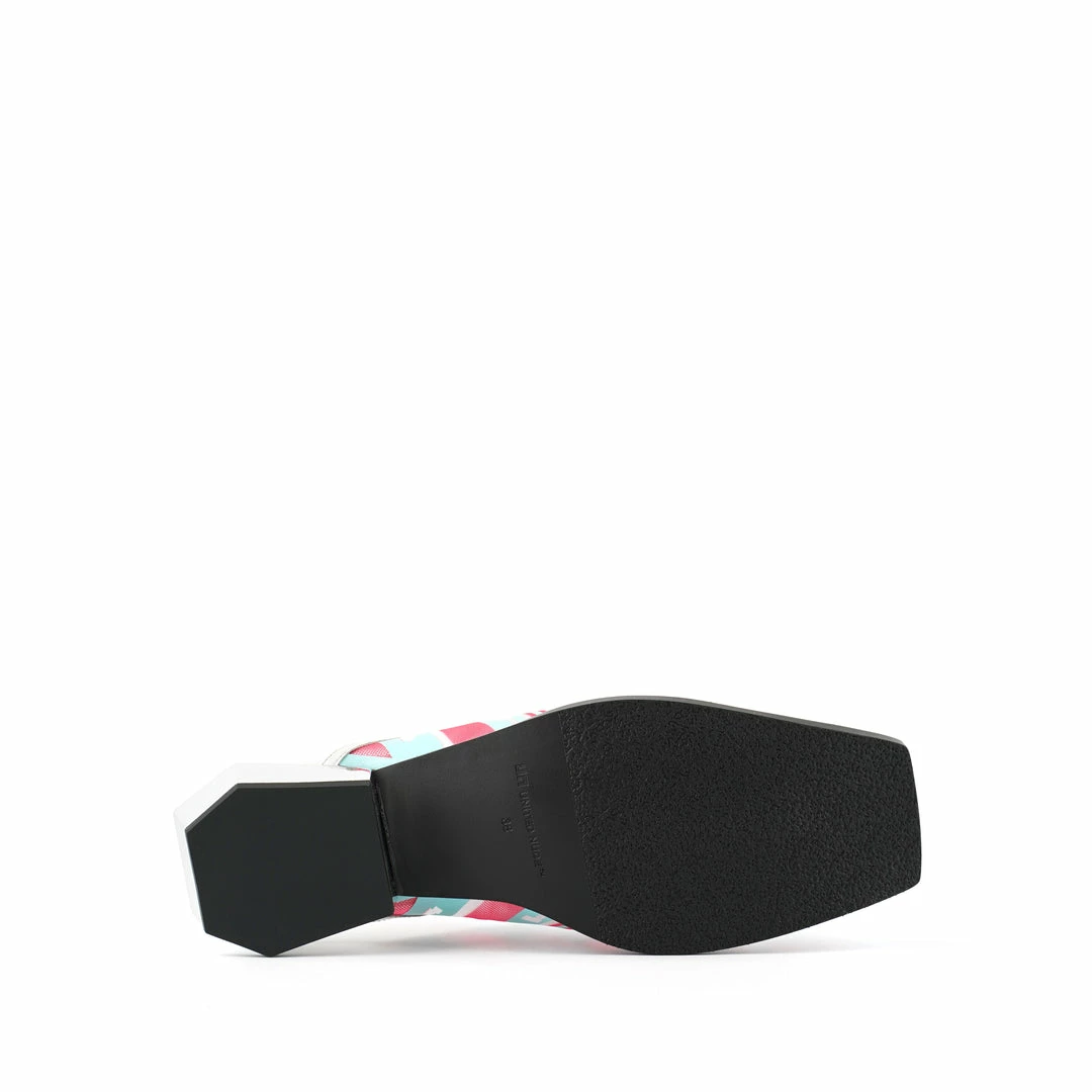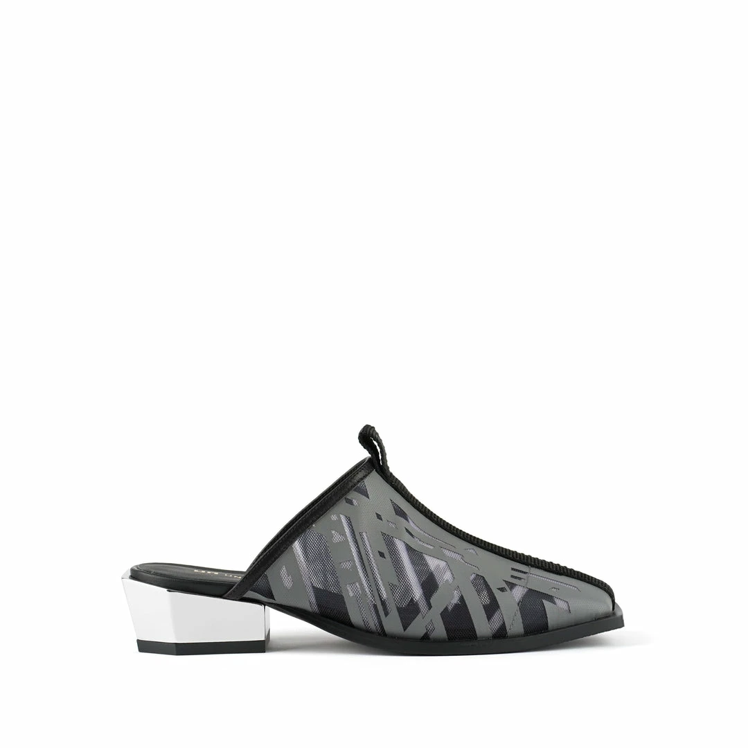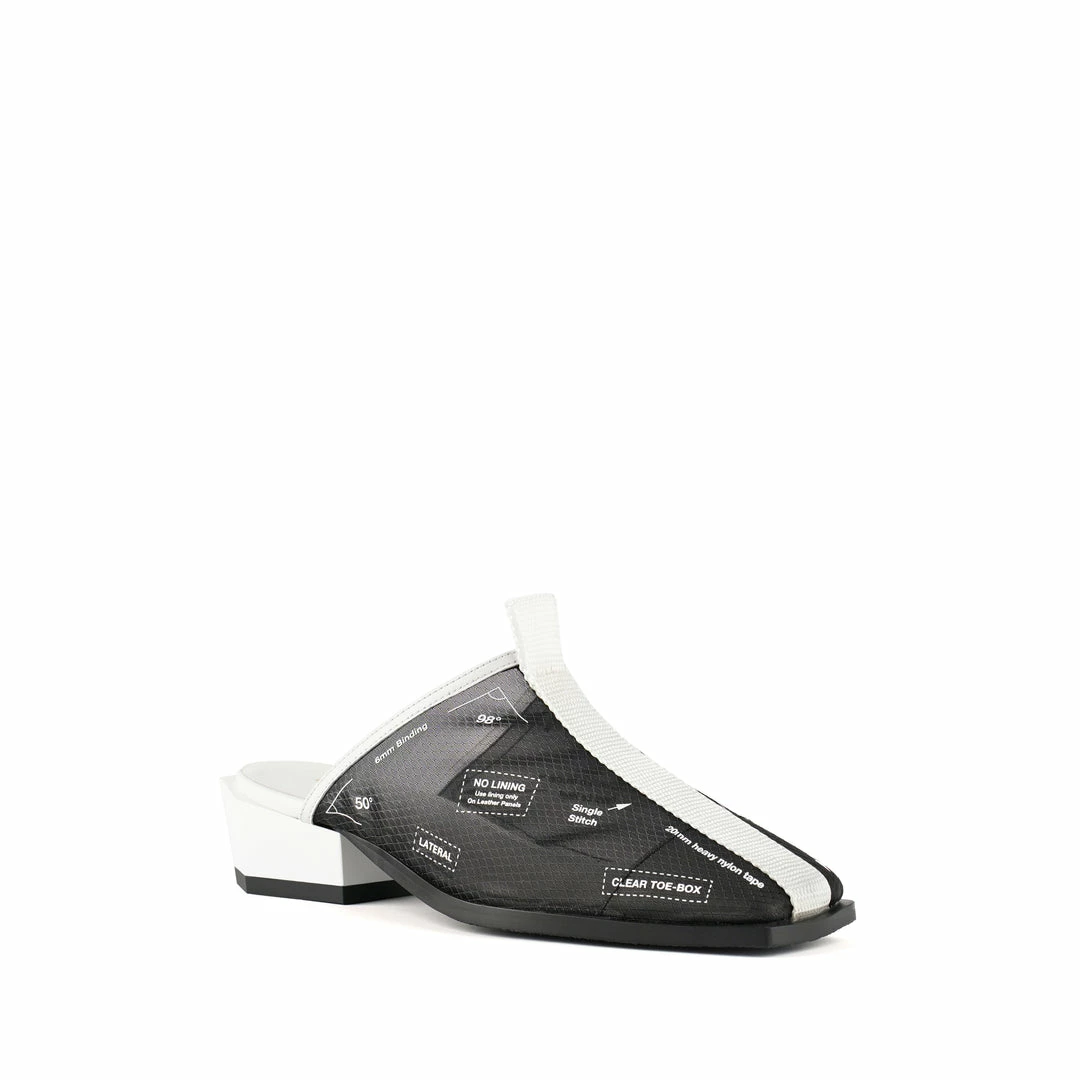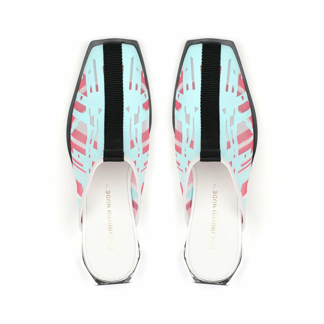 The Rasa Mule is a slip on mule that is lifted by a low geometric block heel. The transparent mesh upper is trimmed with leather and accented with a nylon strip. The heat pressed graphics and striking color breaks are inspired by a series of mixed media paintings by United Nude founder and creative director Rem D. Koolhaas.
