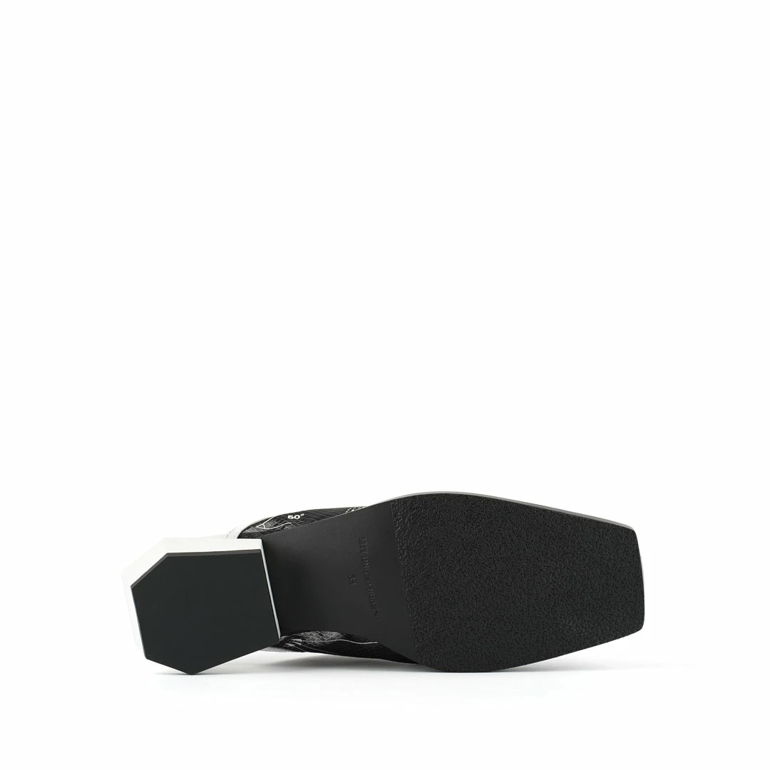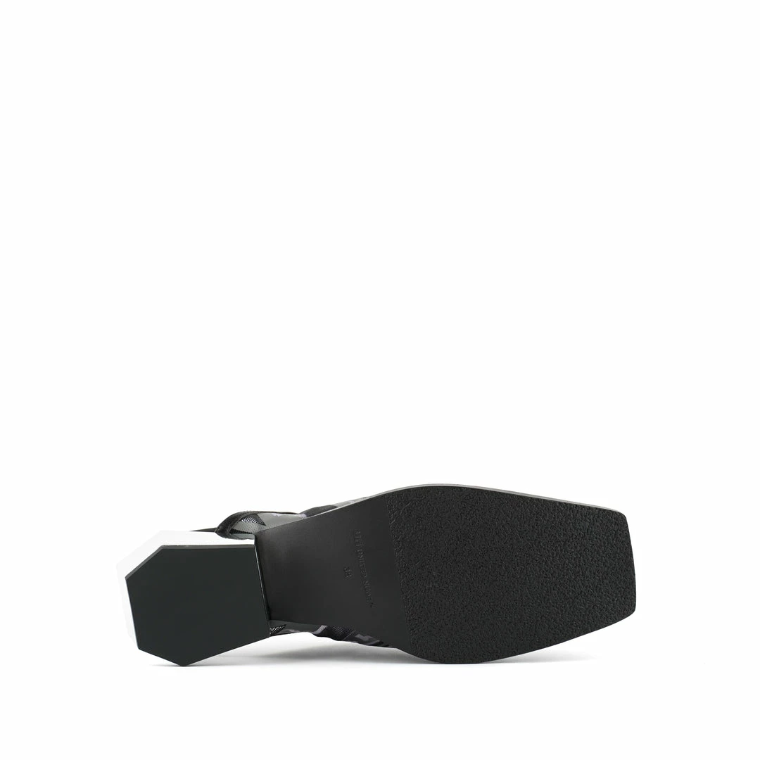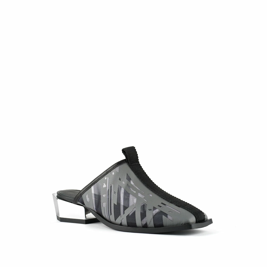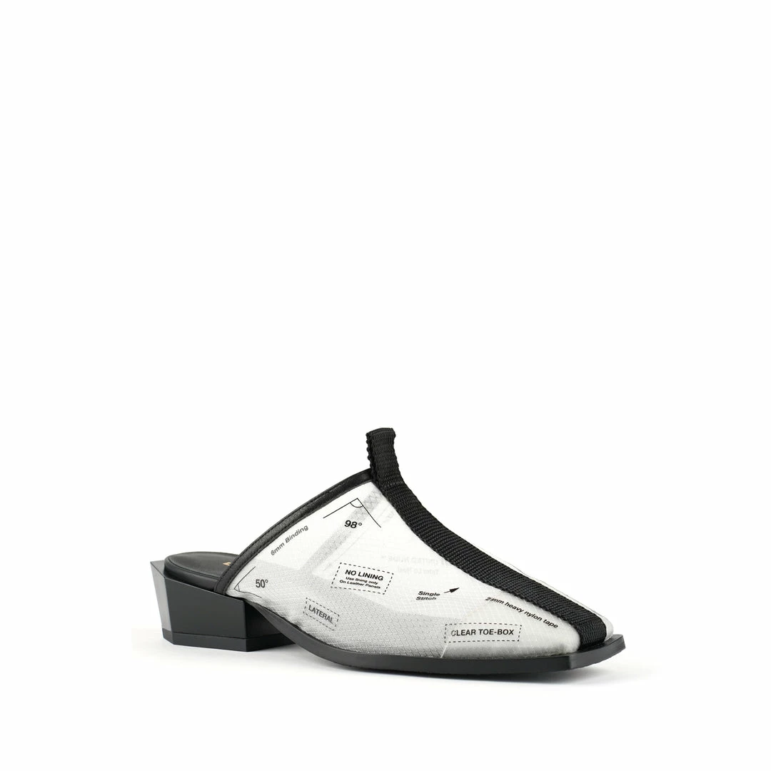 The Rasa Mule is a slip on mule that is lifted by a low geometric block heel. The transparent mesh upper is trimmed with leather and accented with a nylon strip. The heat pressed graphics and striking color breaks are inspired by a series of mixed media paintings by United Nude founder and creative director Rem D. Koolhaas.
