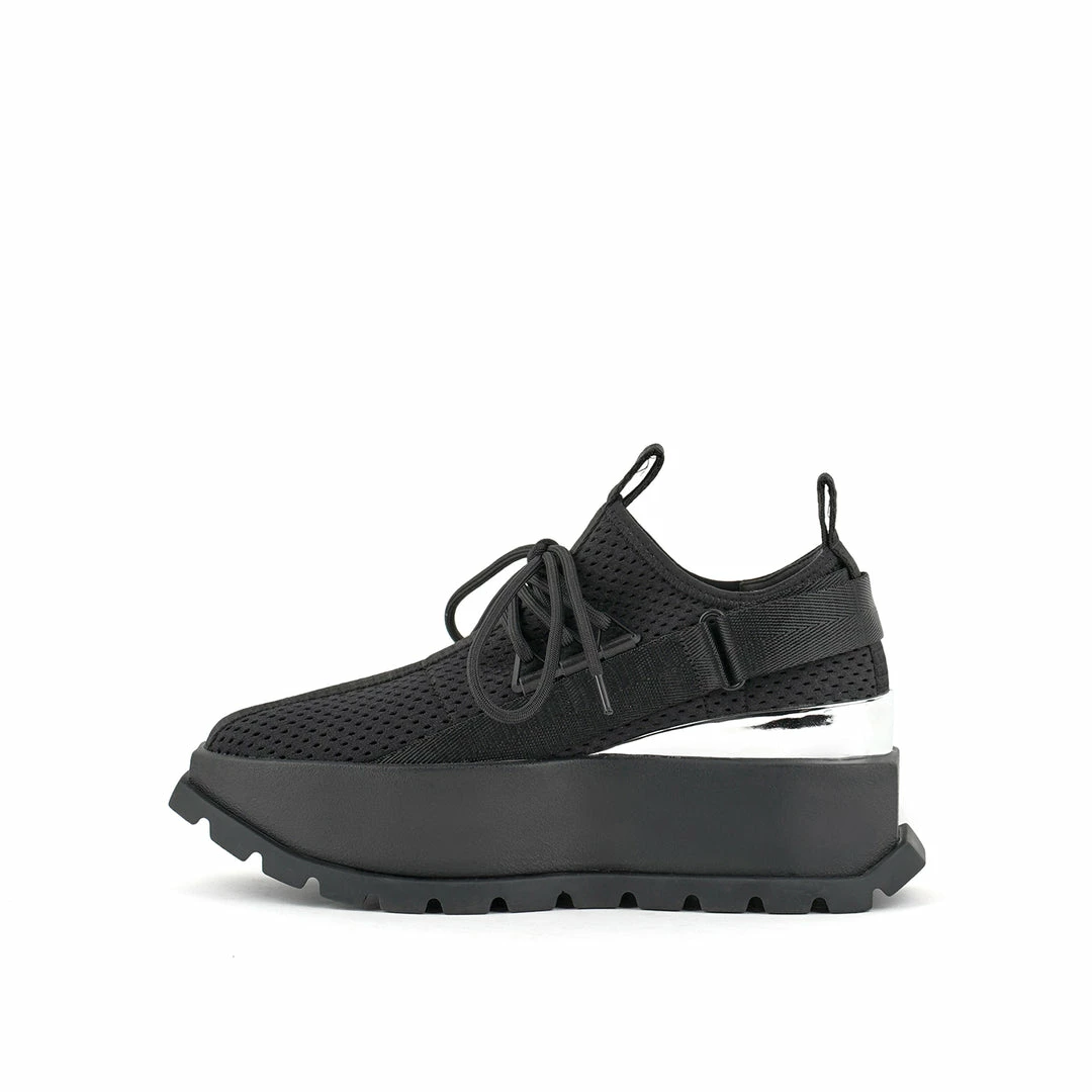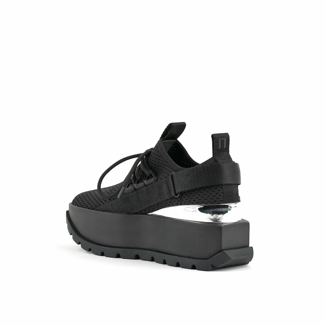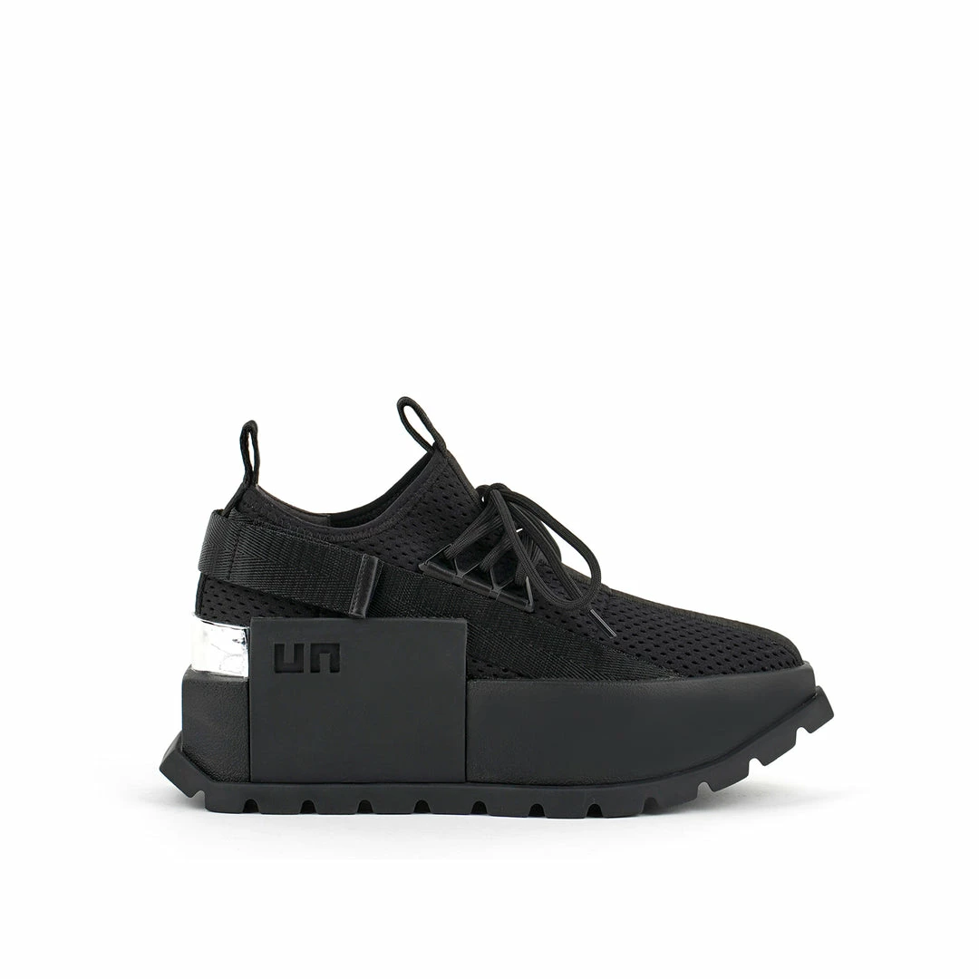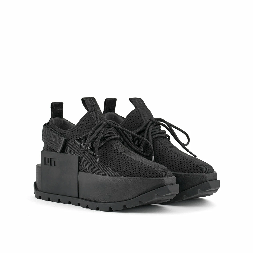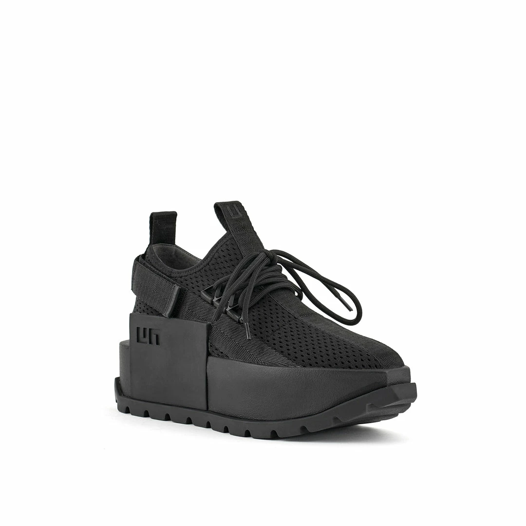 The Roko Space is a wedge platform sneaker lifted by a bold cleated outsole. The geometric silhouette features United Nude’s signature aesthetics, a lace-up design with metal hardware, breathable fabric, velcro straps, signature pull-ups, and a defining block logo.
