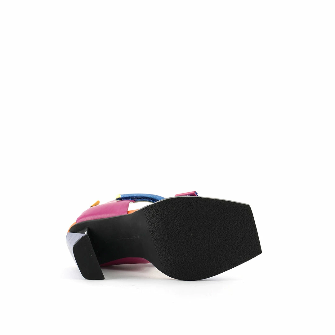 The Run Sandal Hi is a high heel slingback with a leather wrapped heel and sleek metallic accents. Three adjustable nylon straps with hook and loop velcro closures allow for easy on and off wear.