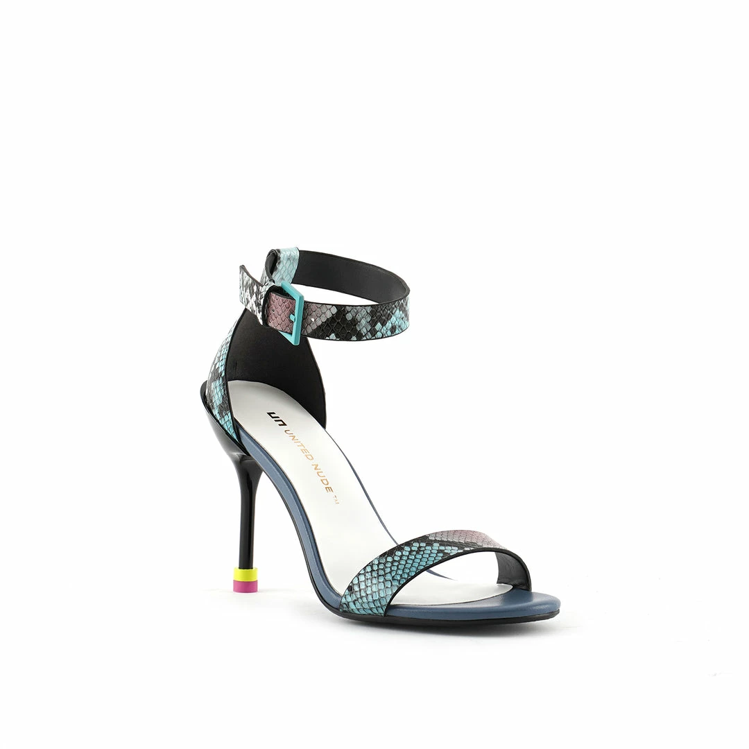 The Square Ankle Strap is a high heeled stiletto with a stacked heel tip and a slim adjustable leather ankle strap.