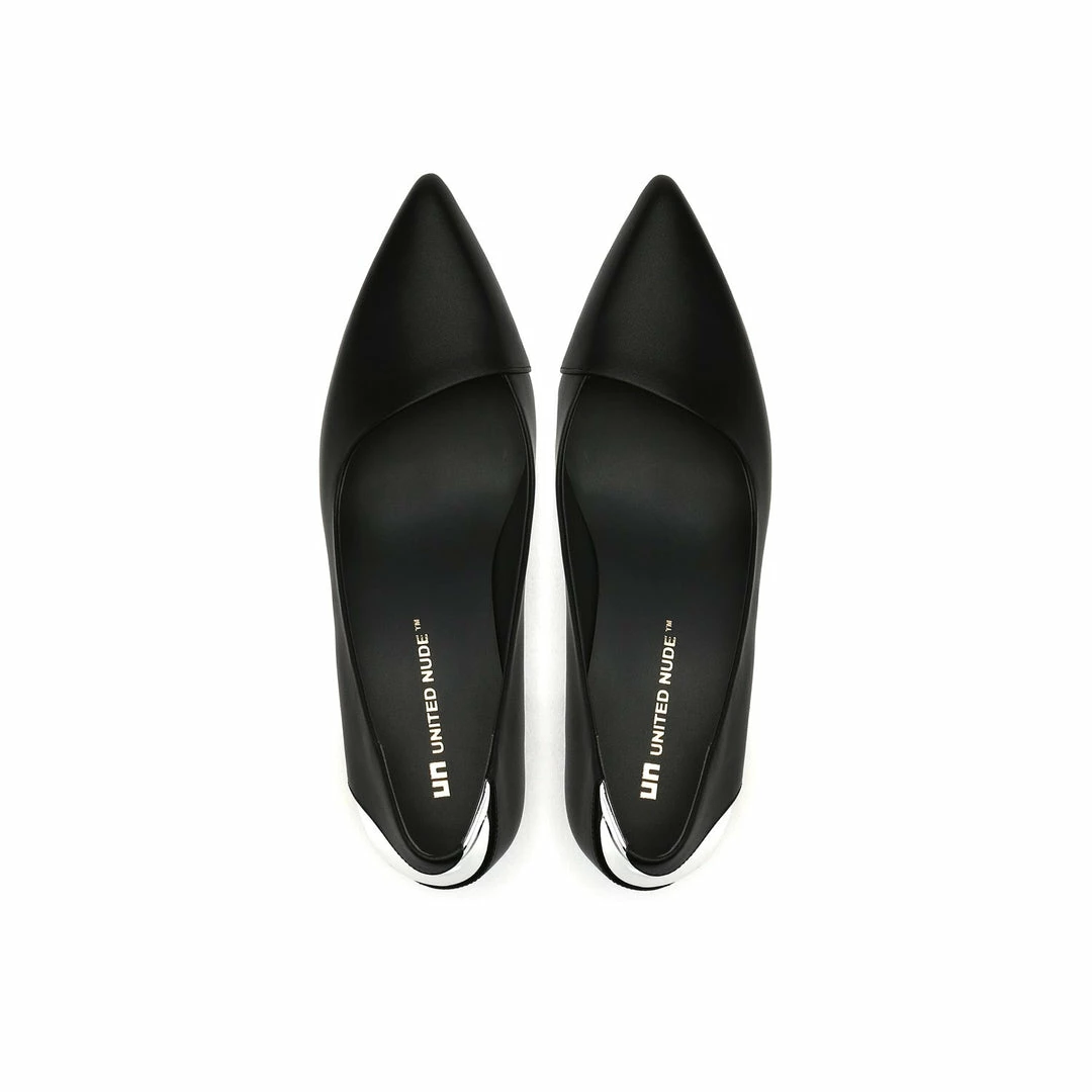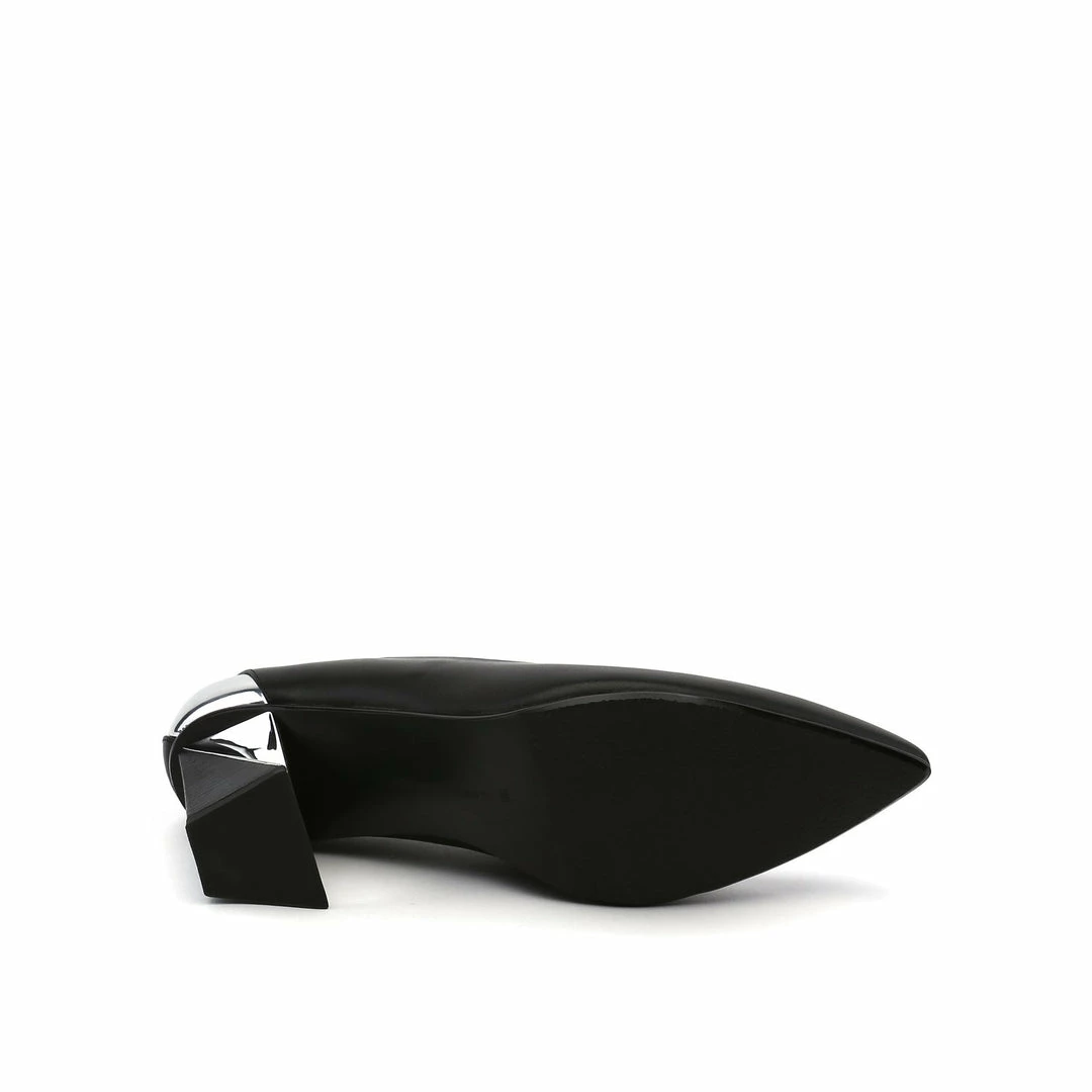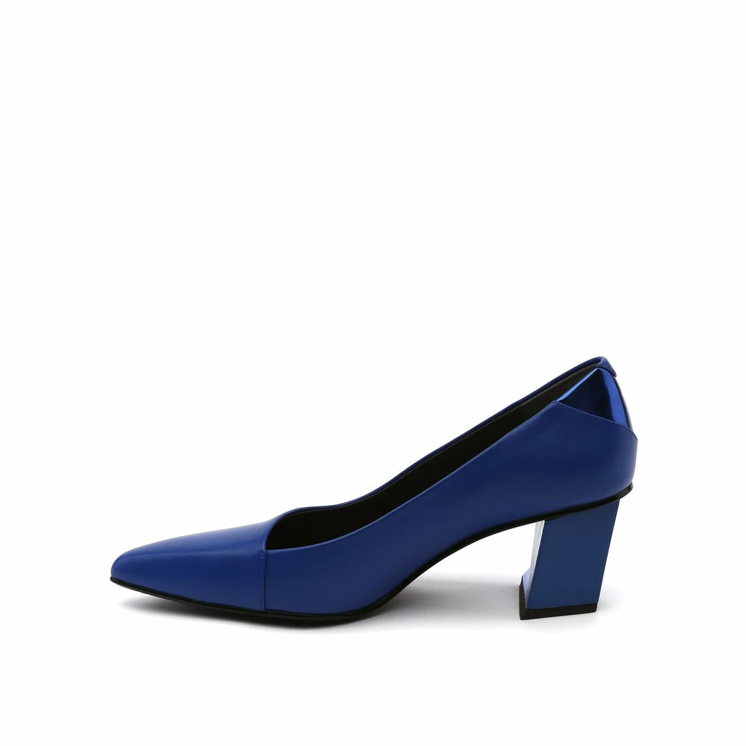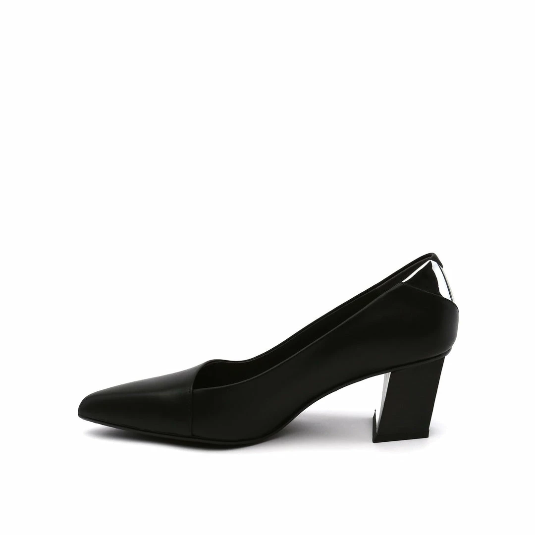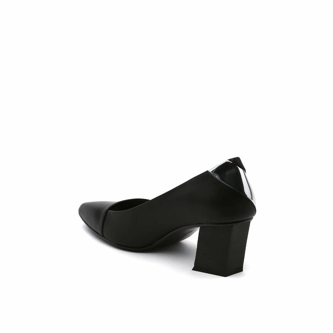The Twist Flow Pump is a mid height pointy-toe pump with a stacked leather and contorted chrome plated heel. The heels mirrored surface climbs around the shoe to enhance this classic silhouette.