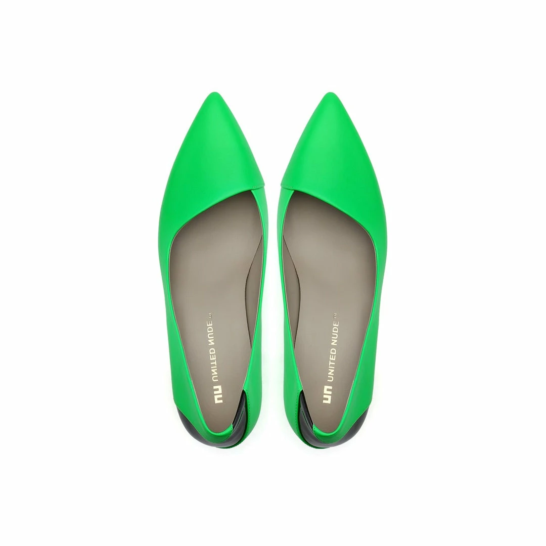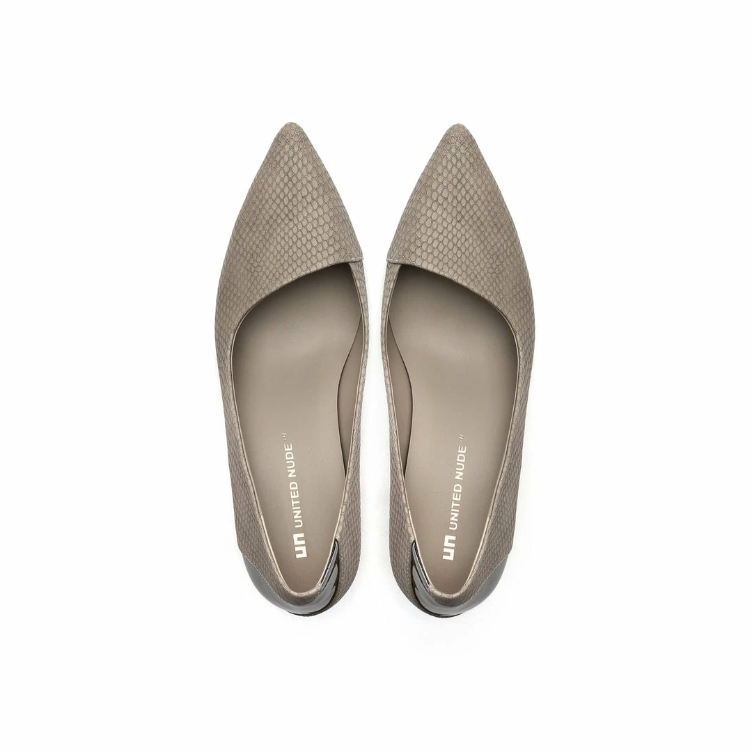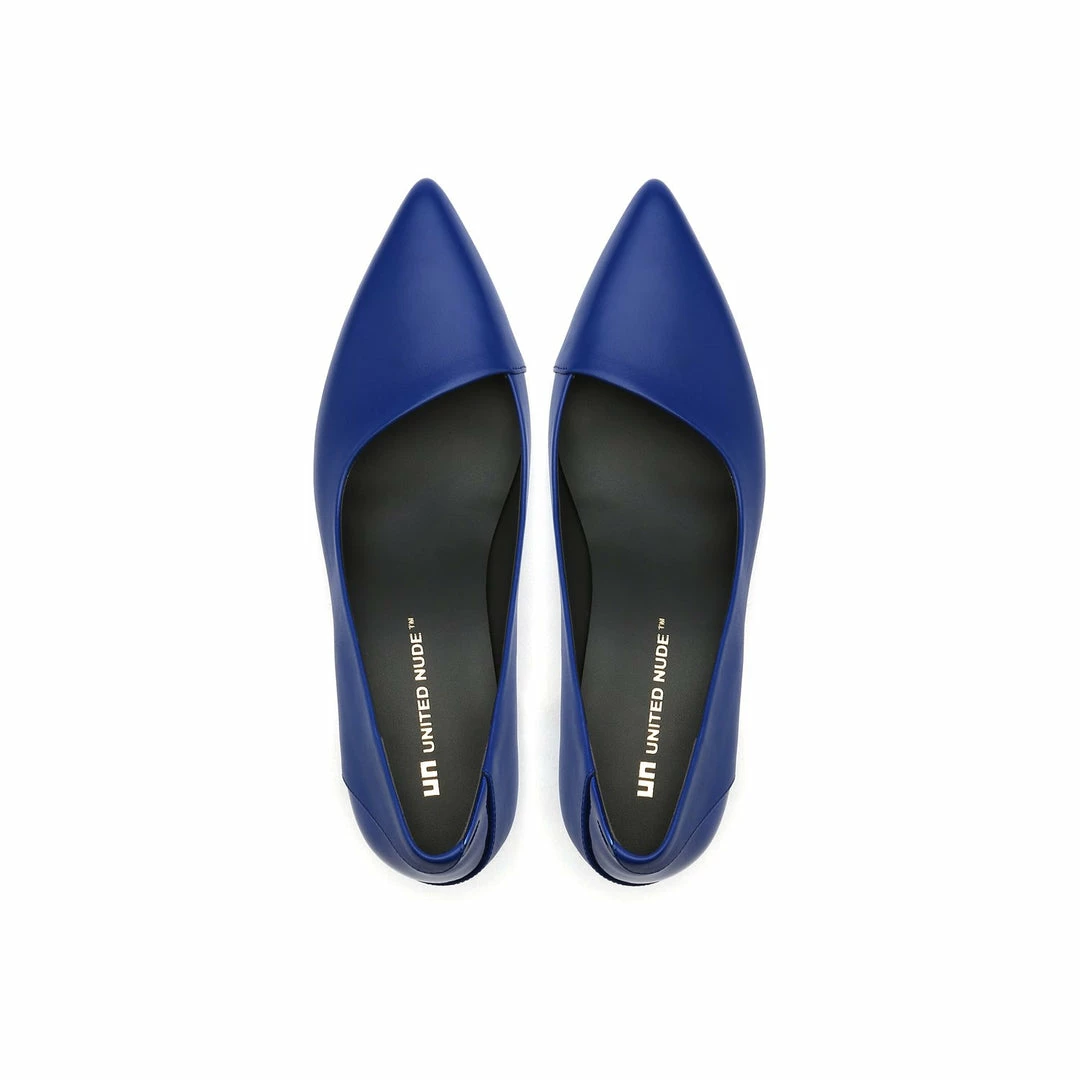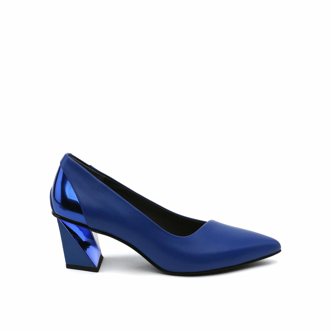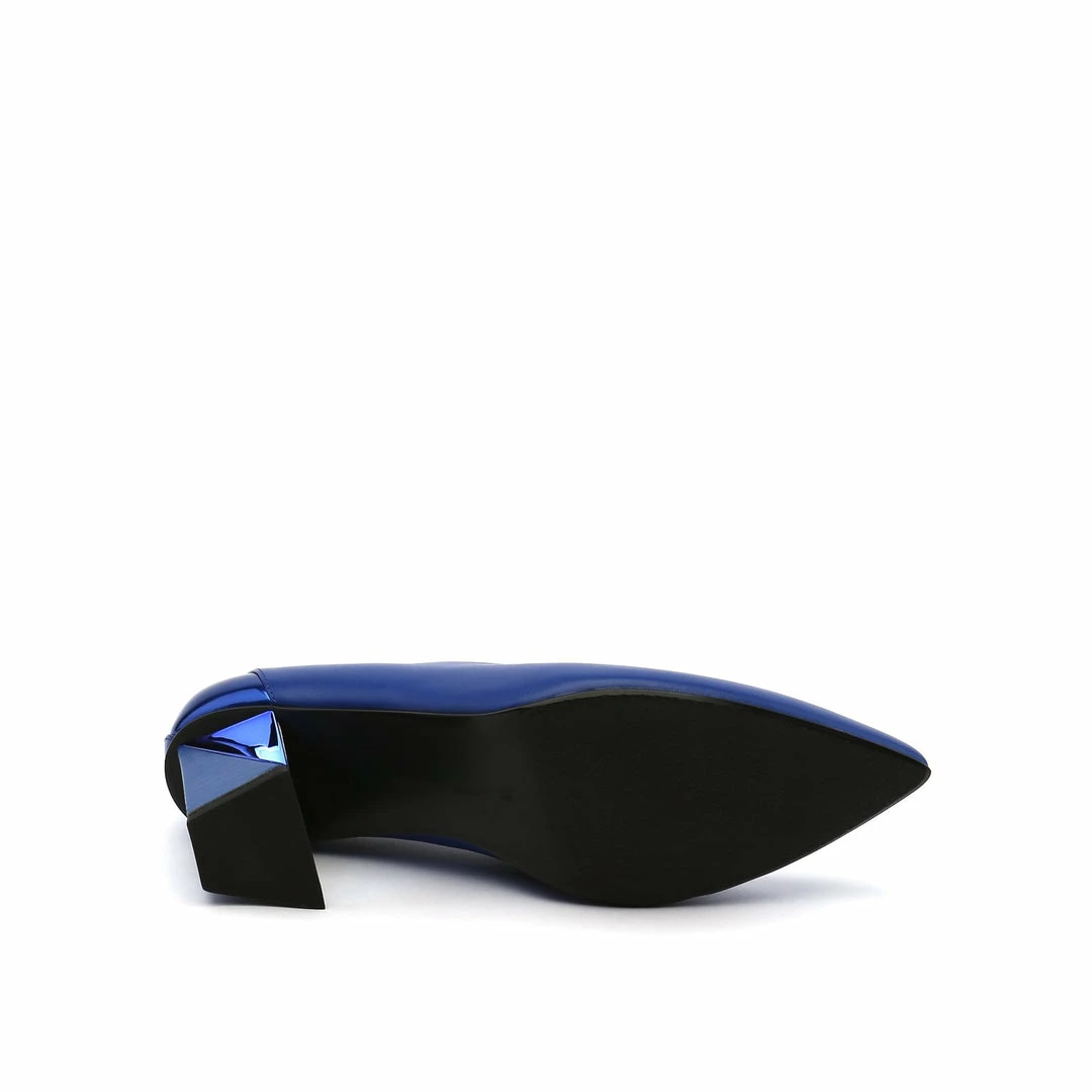 The Twist Flow Pump is a mid height pointy-toe pump with a stacked leather and contorted chrome plated heel. The heels mirrored surface climbs around the shoe to enhance this classic silhouette.