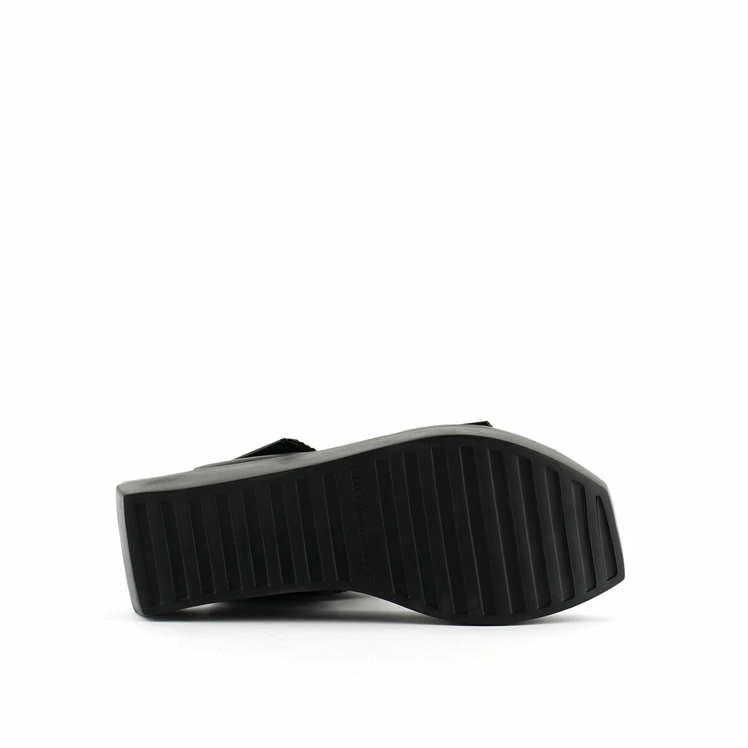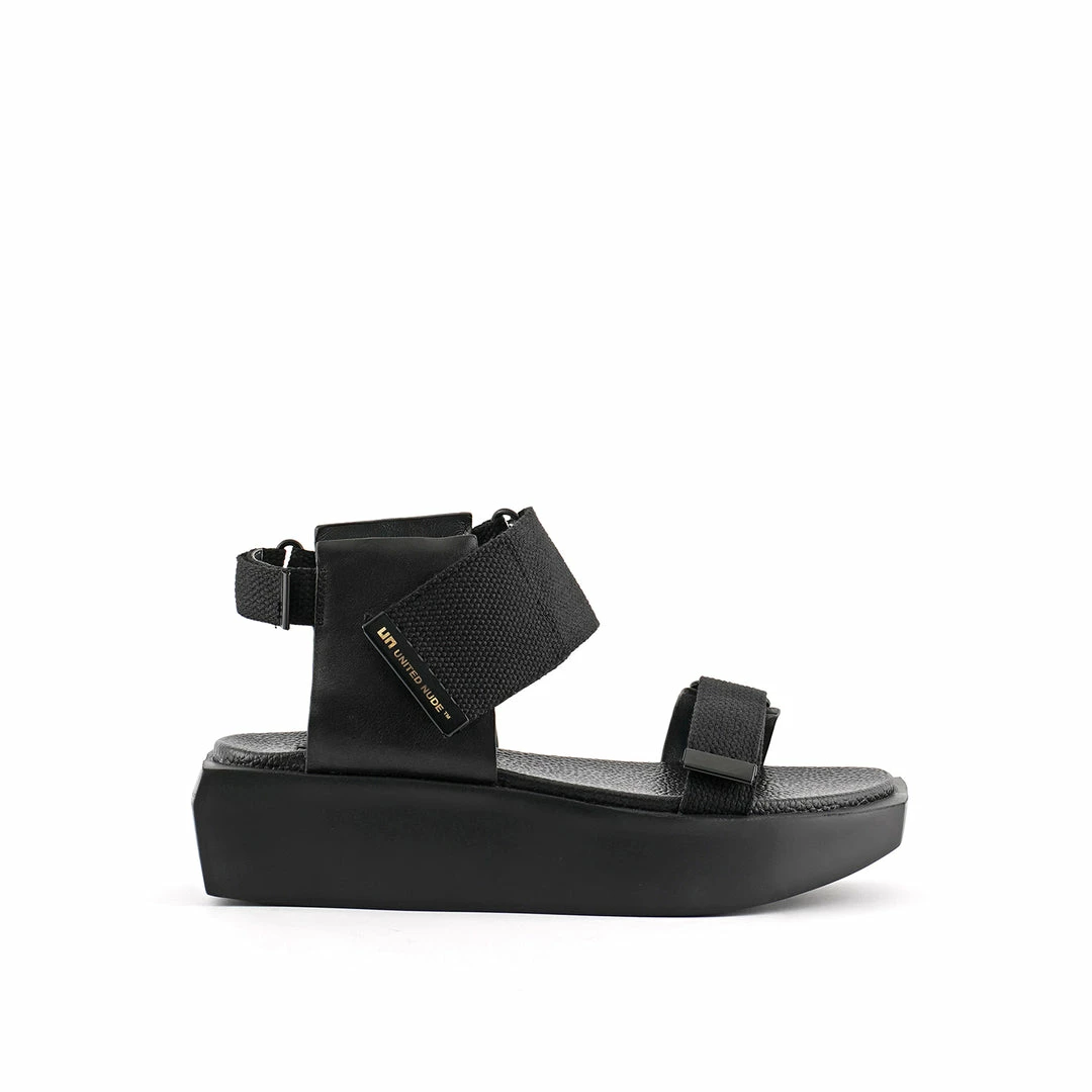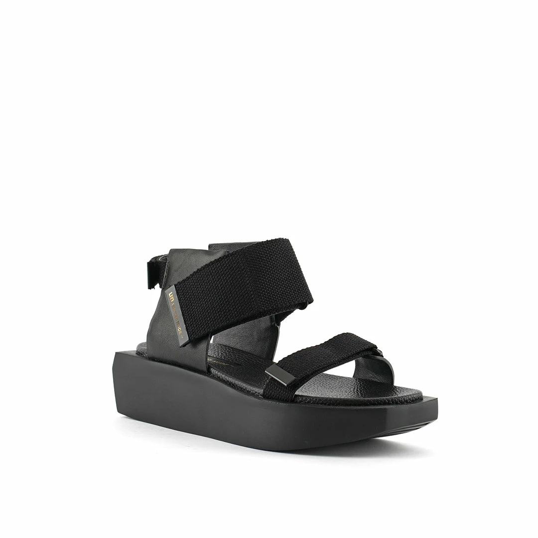 The Wa Lo is a flatform sandal featuring three adjustable cotton straps, metal tips, velcro closures, and a sculptural EPR outsole.