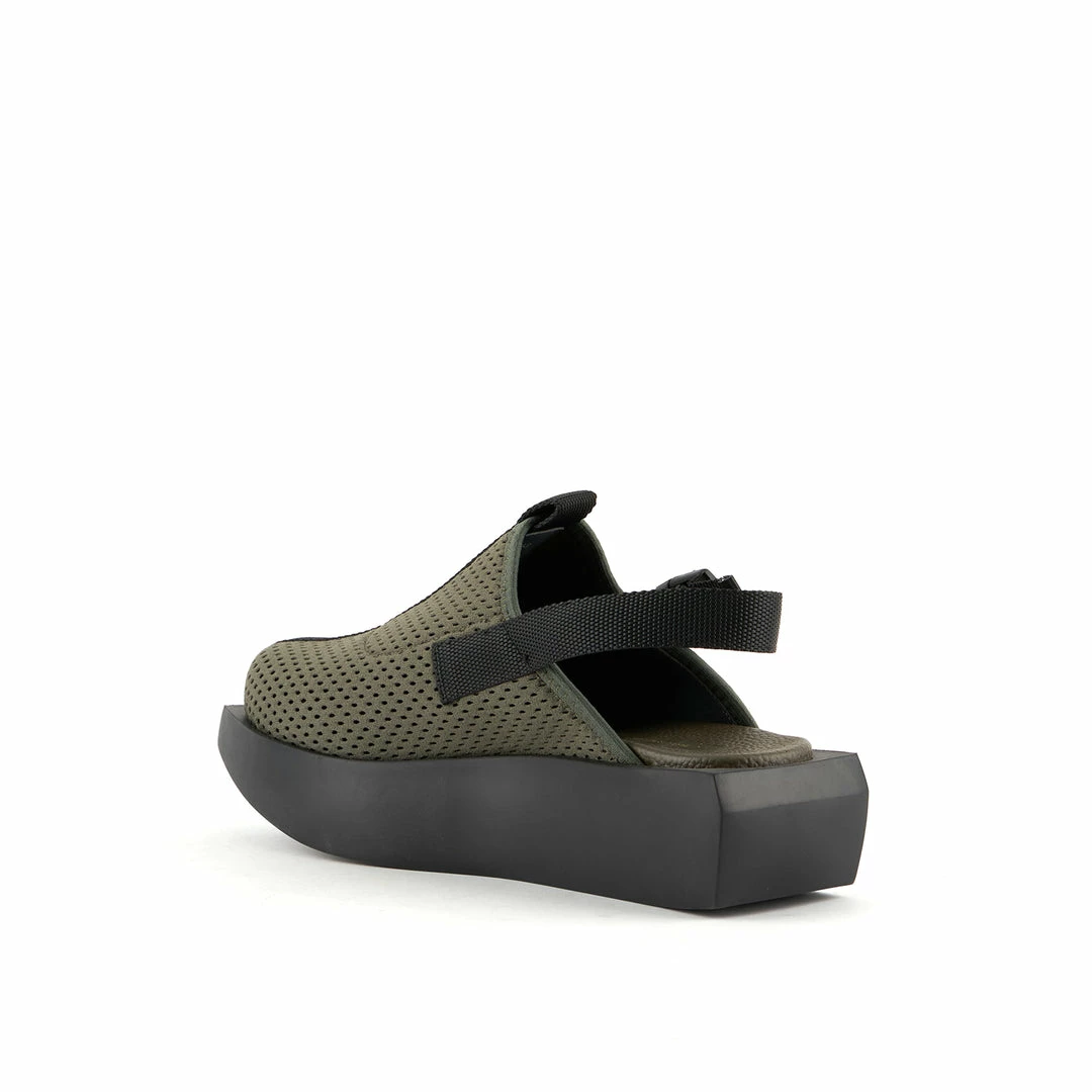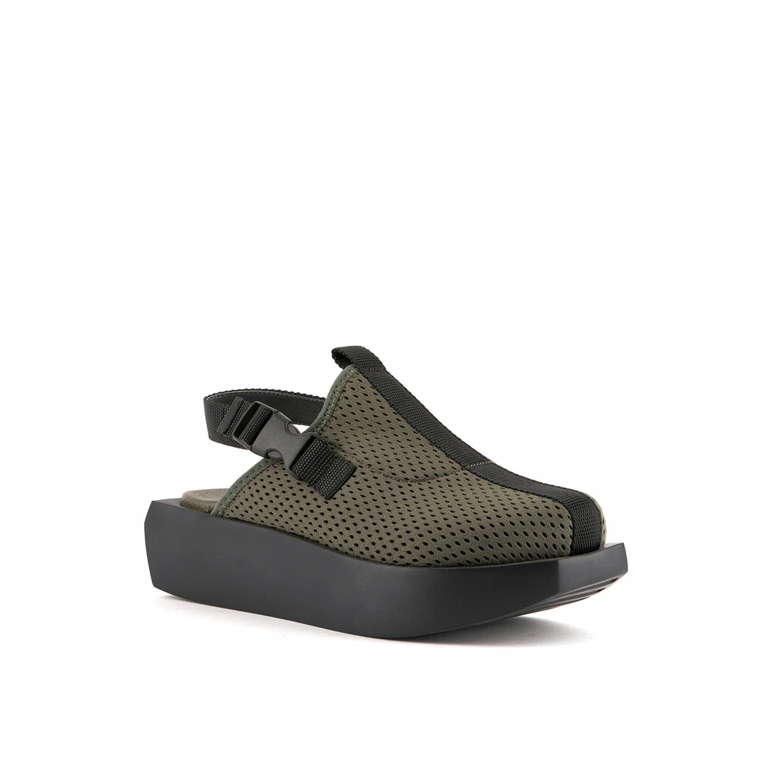 The Wa Mule Lo is a round-toe flatform with a sculptural EPR outsole and an adjustable nylon backstrap with buckle closures.