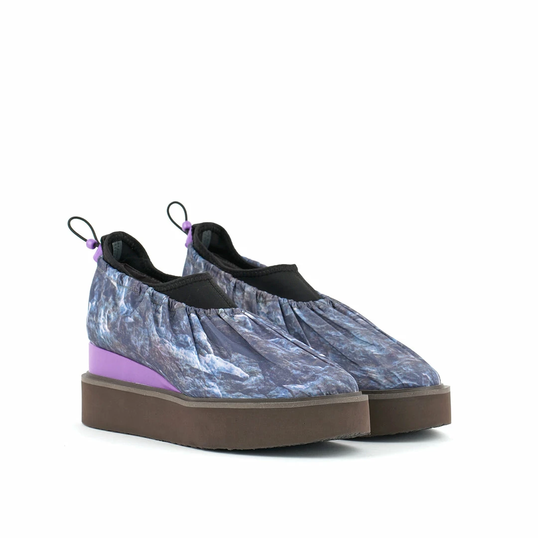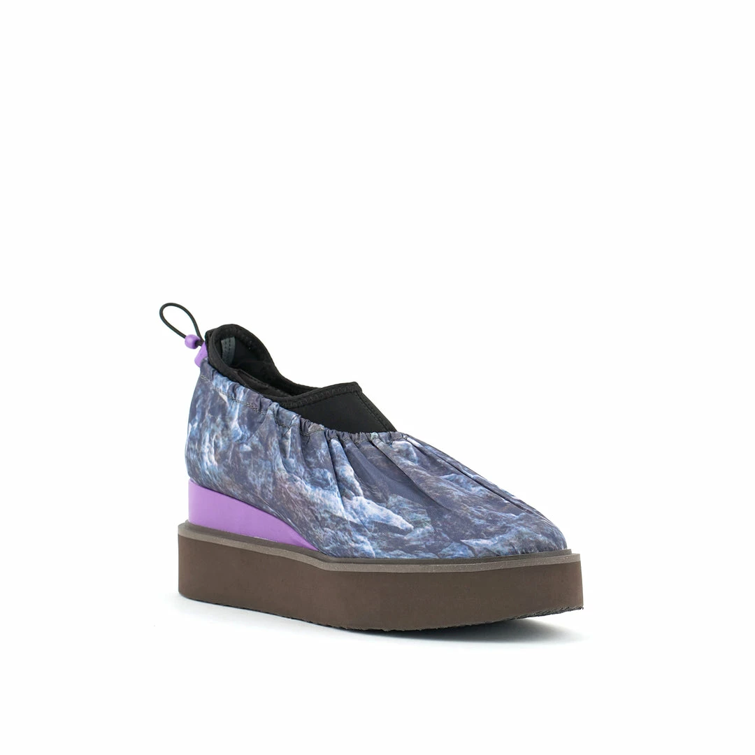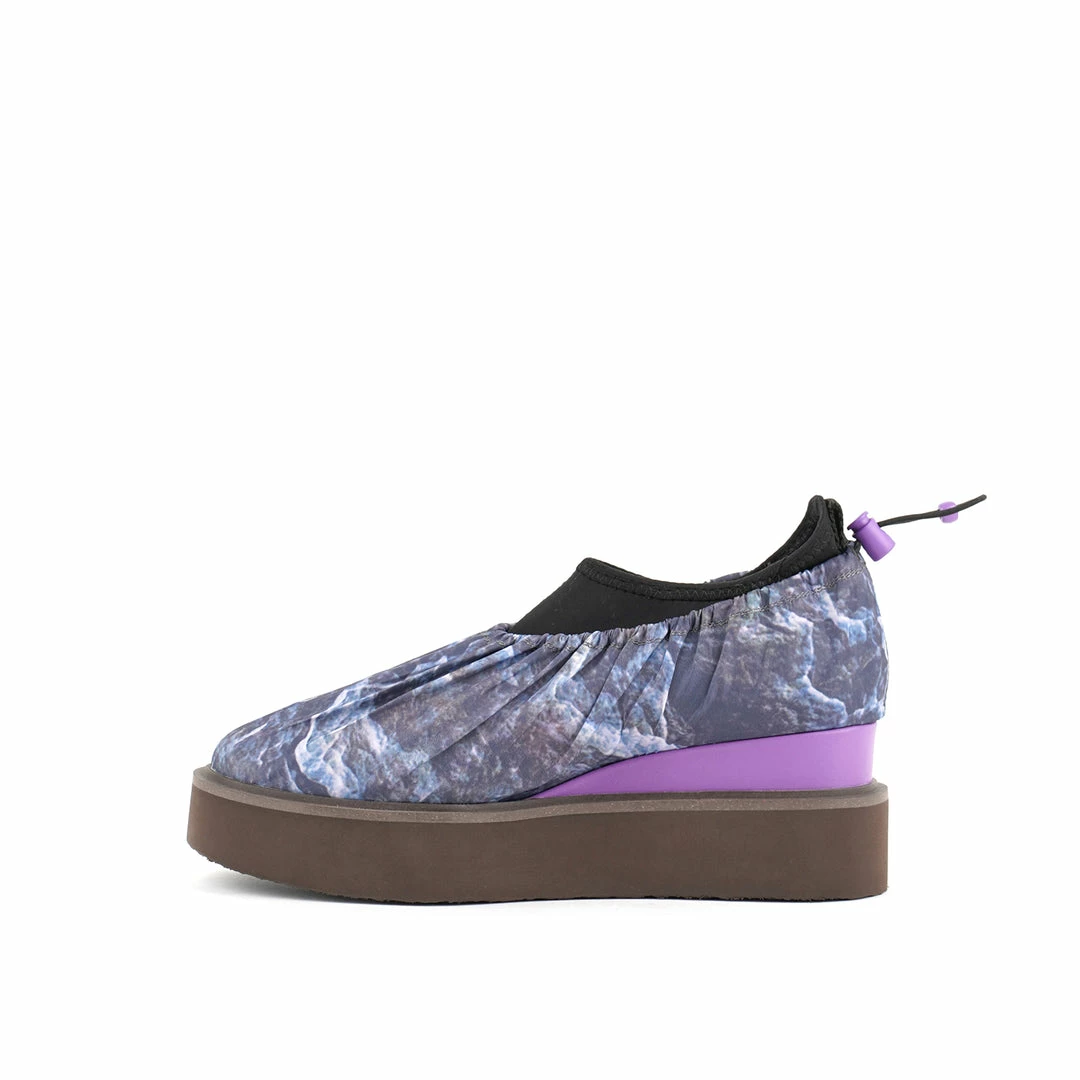 The Cover Casual is a comfortable flatform slip on with a sock-like neoprene upper and a nylon fabric overlay. An exposed wedge adds a gentle lift. This style is inspired by the outdoors – finished with a light collapsible fabric, a ruched topline, and an adjustable drawstring toggle.
