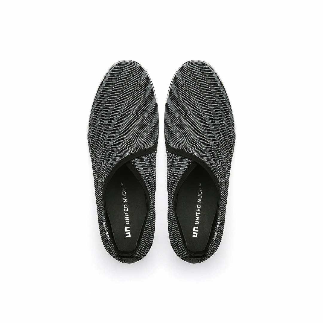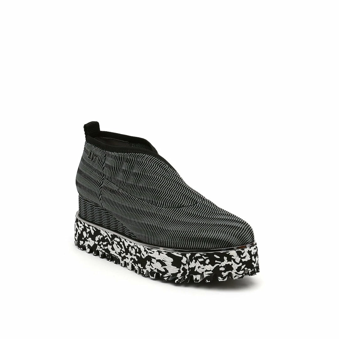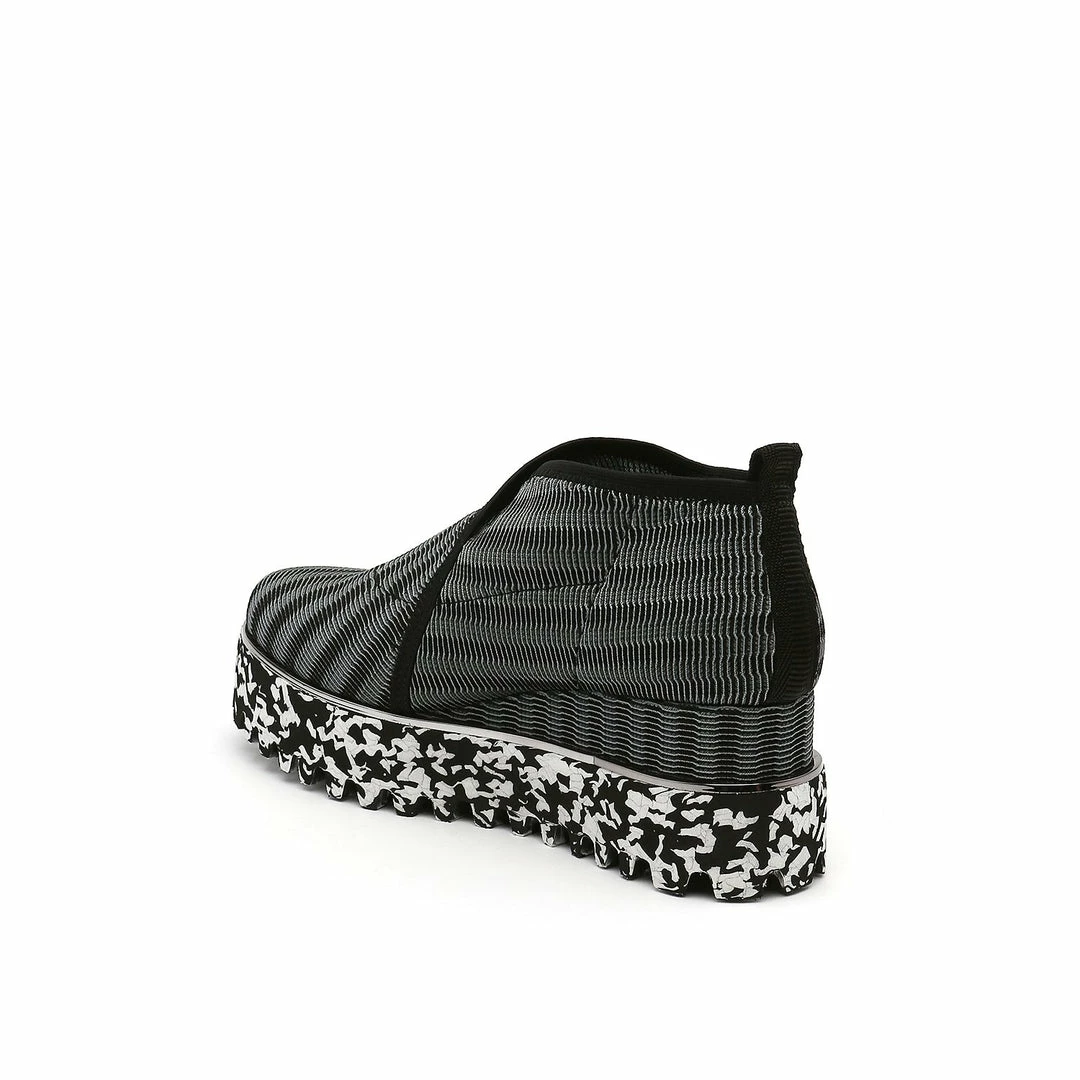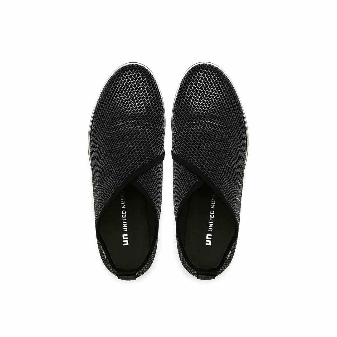 The Fold Casual II is a flatform slip on with an asymmetrical topline and cleated platform outsole. An exposed wedge adds a gentle lift to these metallic trimmed shoes.