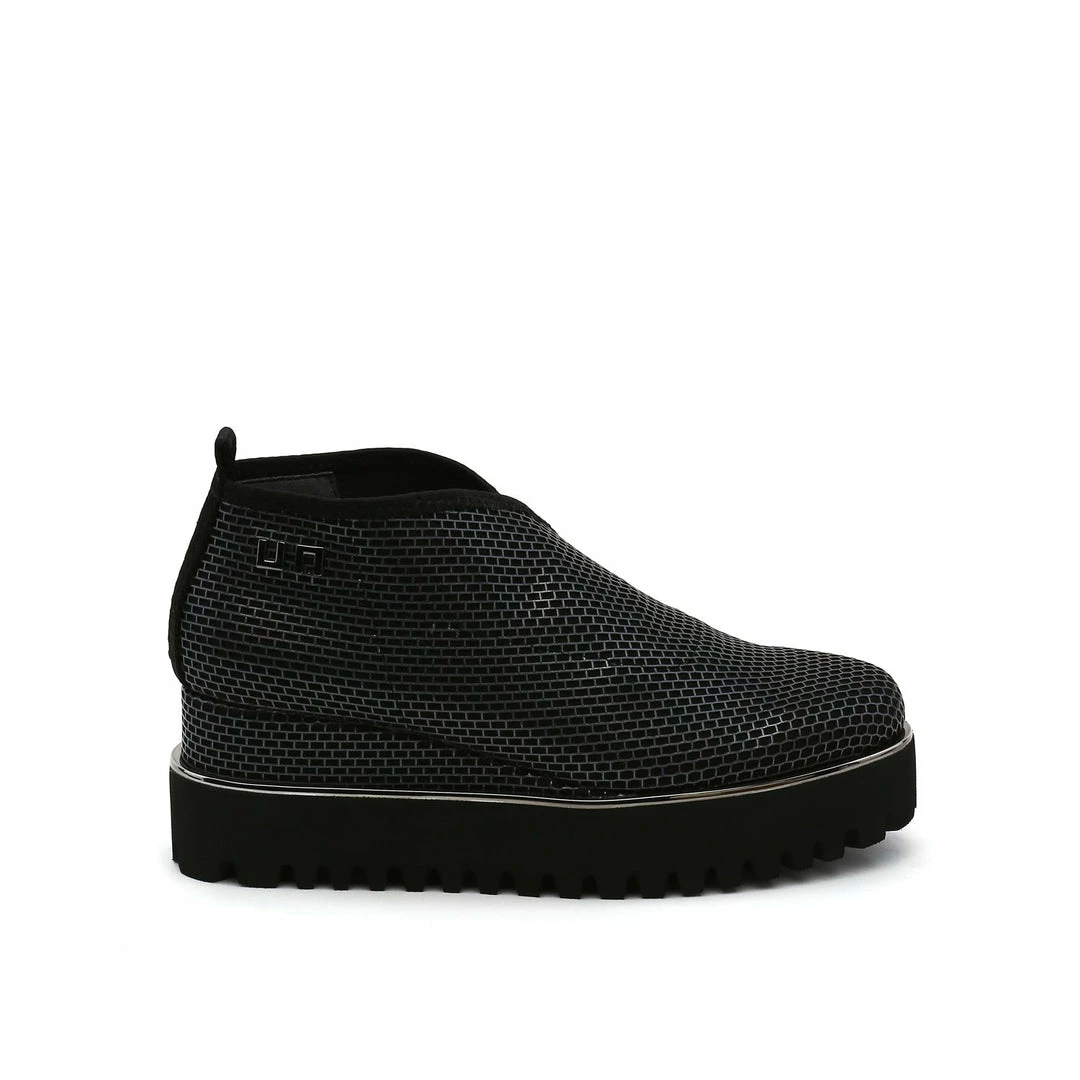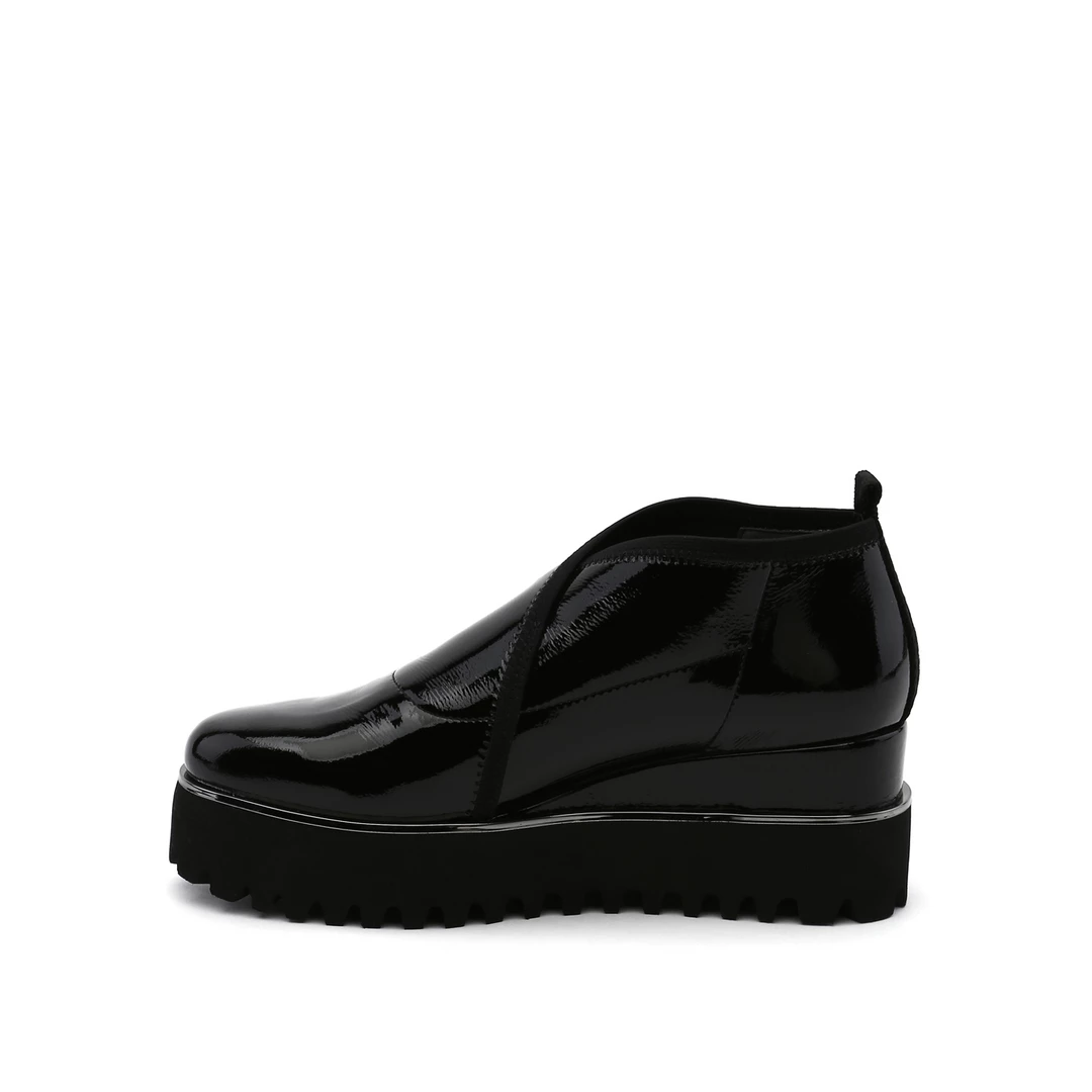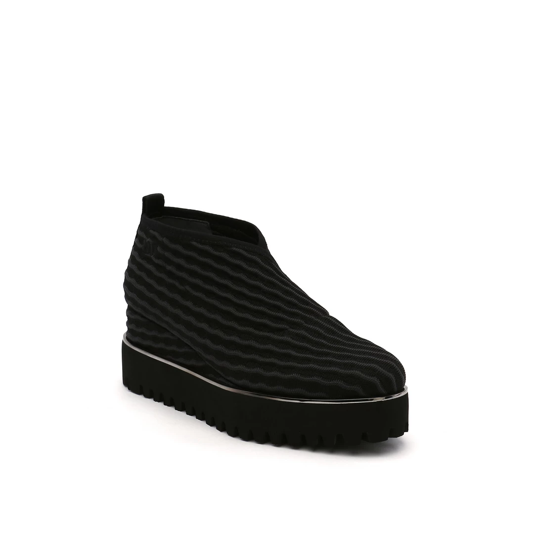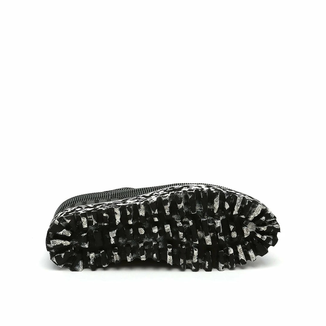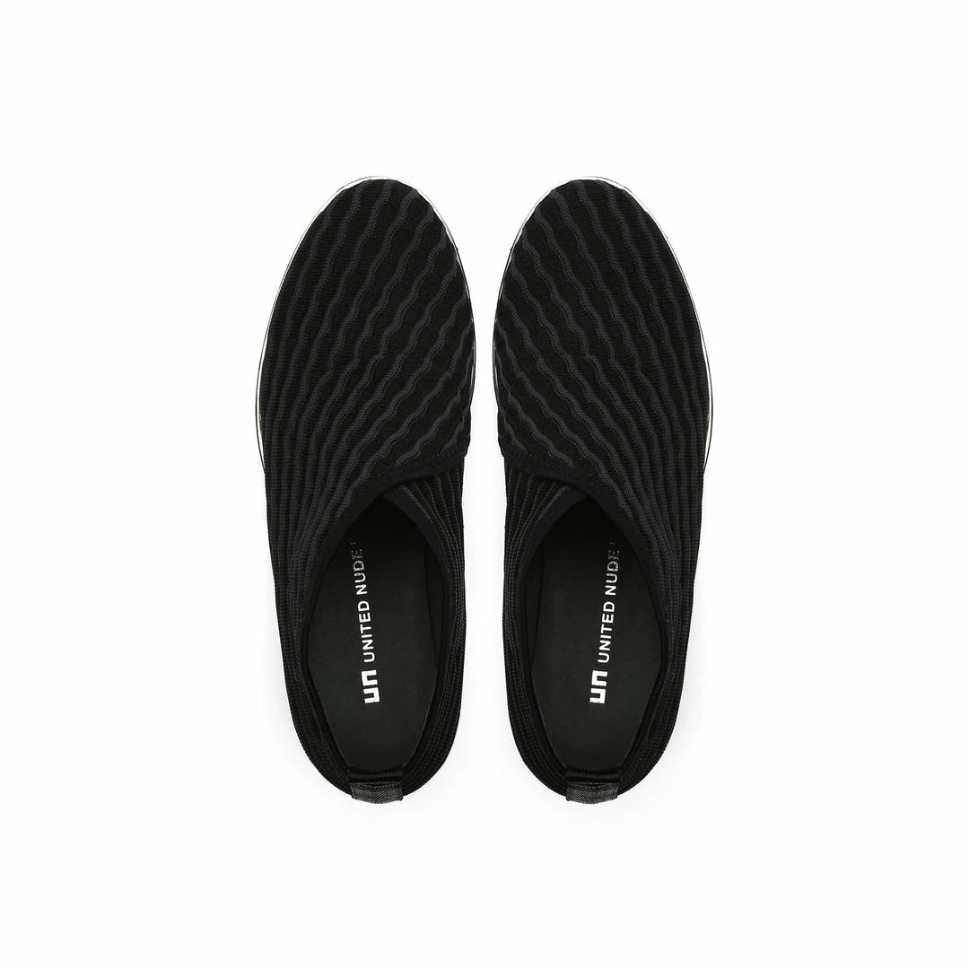 The Fold Casual II is a flatform slip on with an asymmetrical topline and cleated platform outsole. An exposed wedge adds a gentle lift to these metallic trimmed shoes.