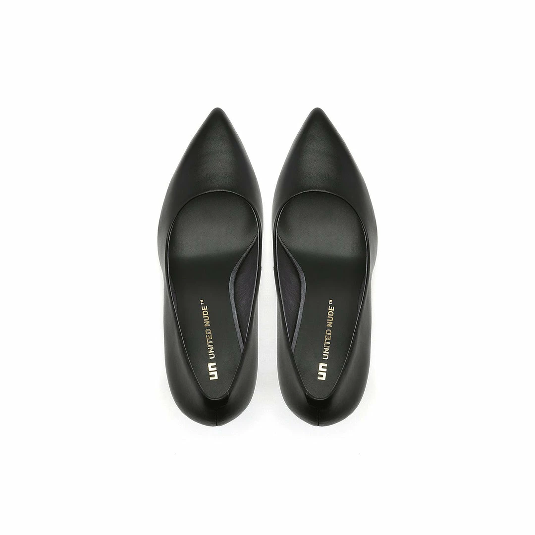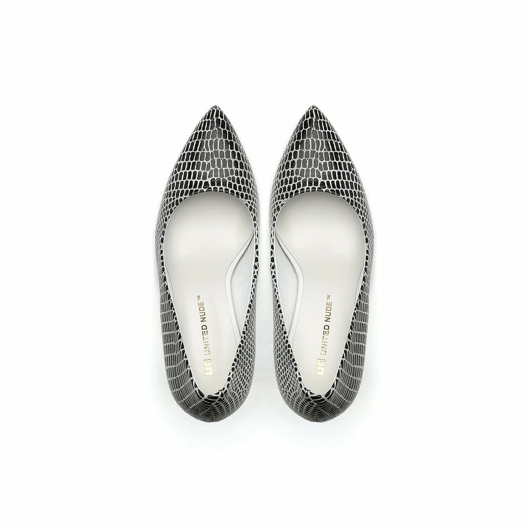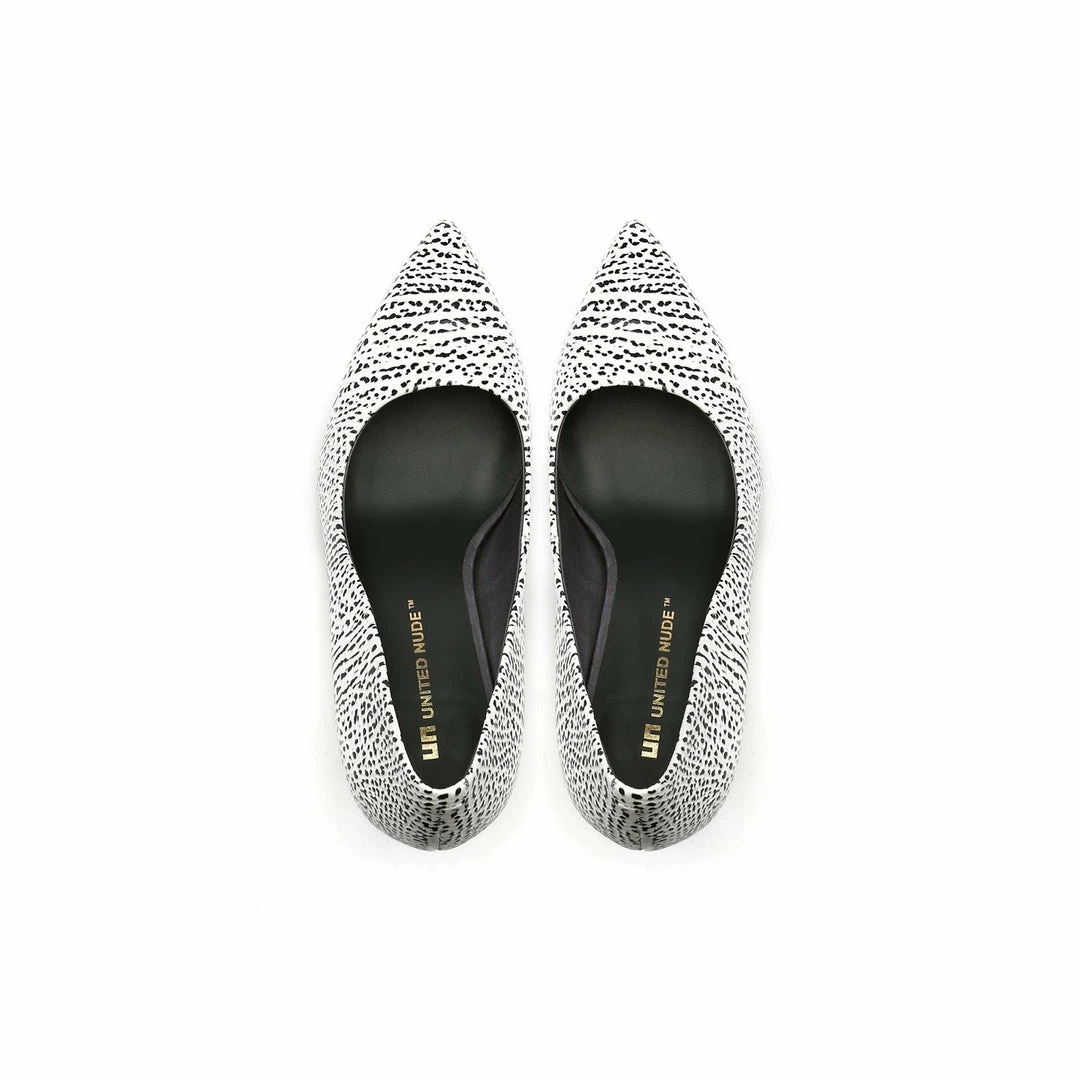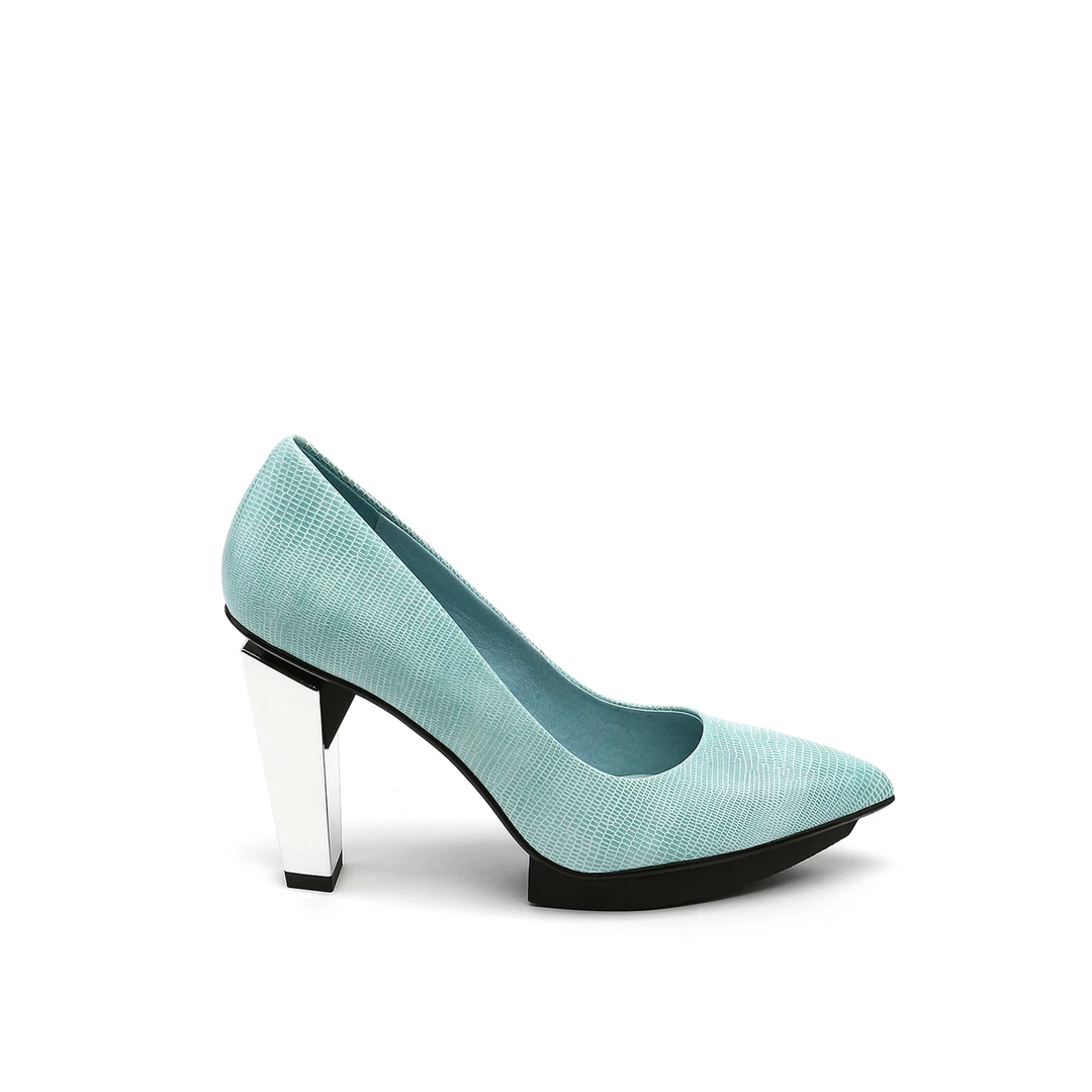 The LEV Pump Hi is a classic platform high heel pump featuring a sleek pointed toe and a striking chrome-plated heel.