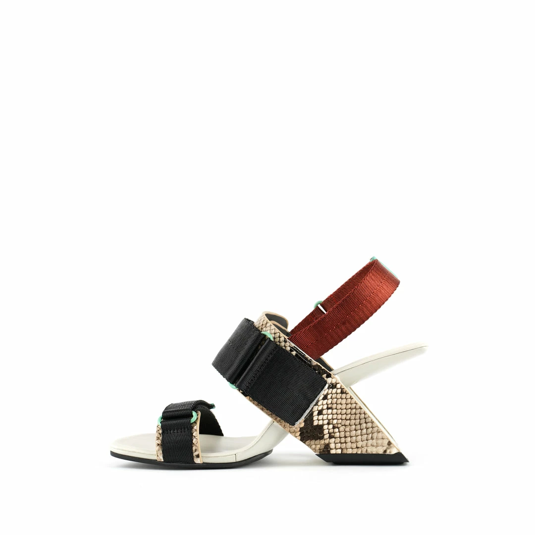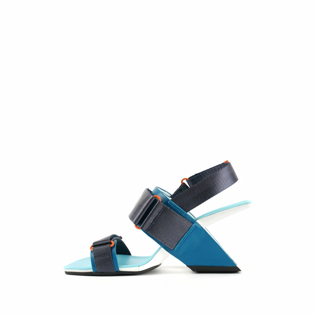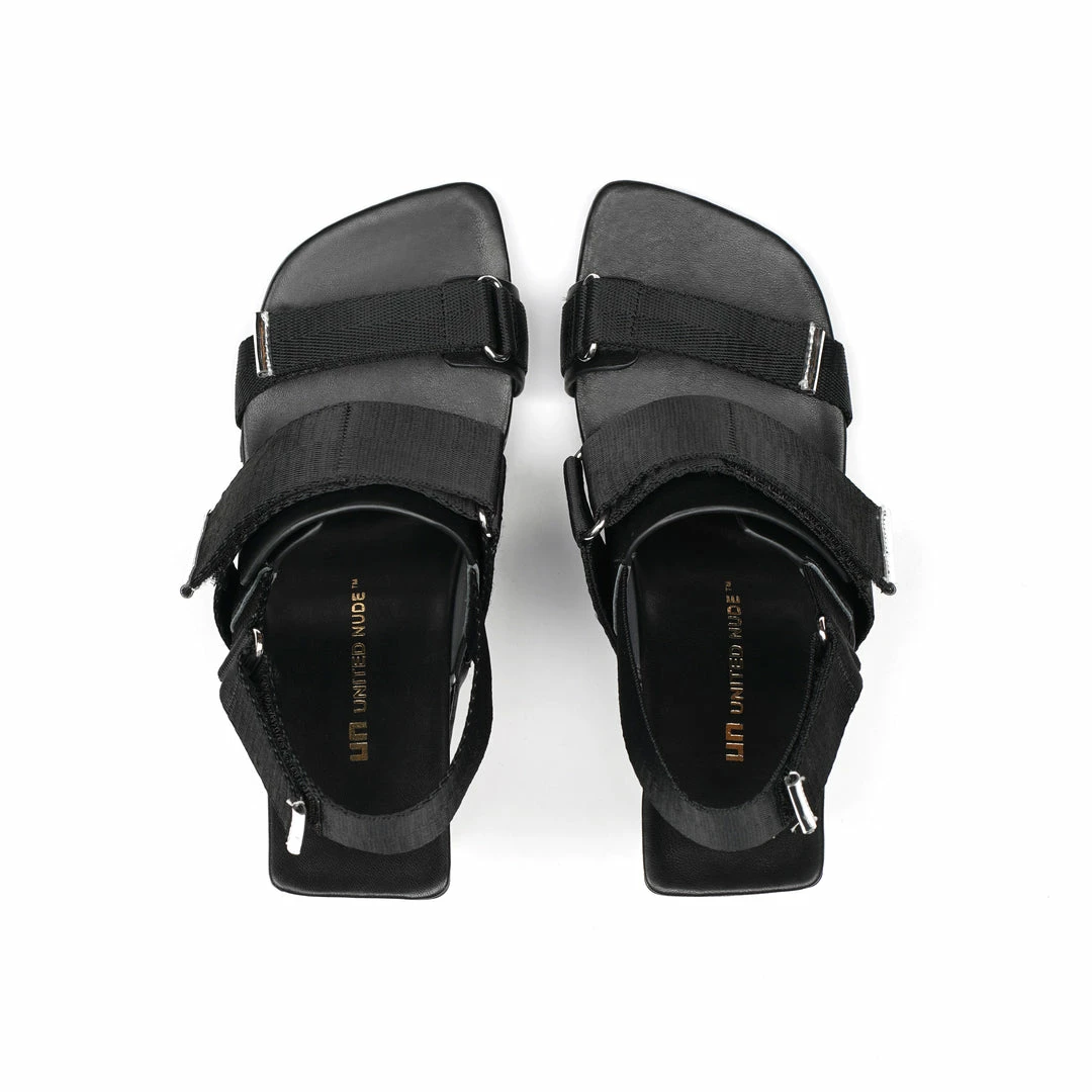The Loop Run features UN’s signature cantilevered Loop Hi heel. Three adjustable nylon + velcro strap enclosures offer utility and an optimal fit to the updated minimalist sandal.