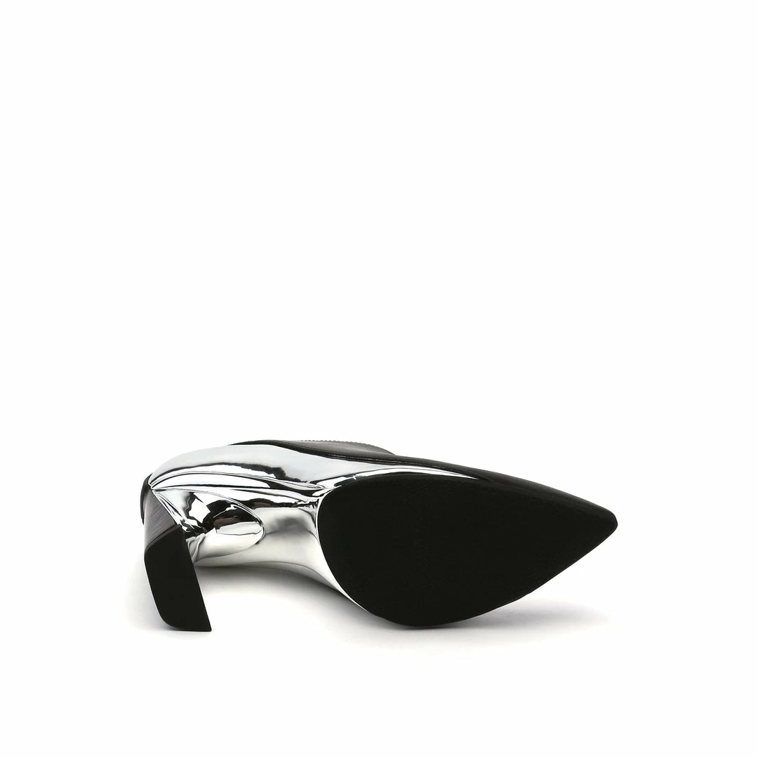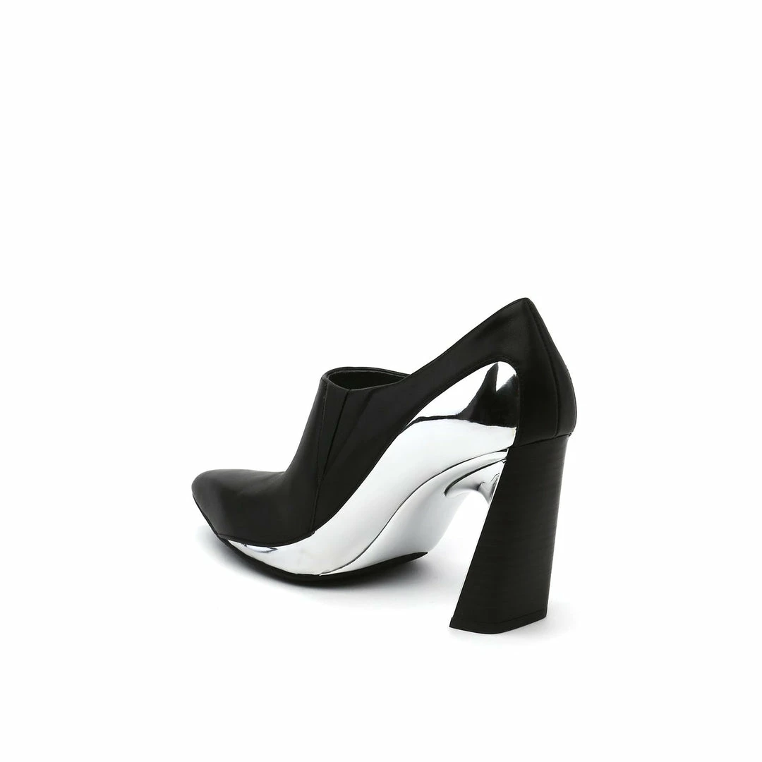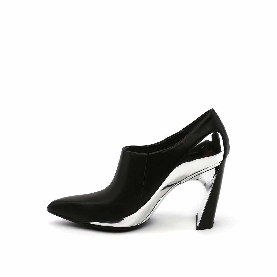 The Molten Flow Bootie Hi is a high heel pointy-toe bootie with a curved top line and semi-chromed heel that seemingly contorts into an arching metallic panel.