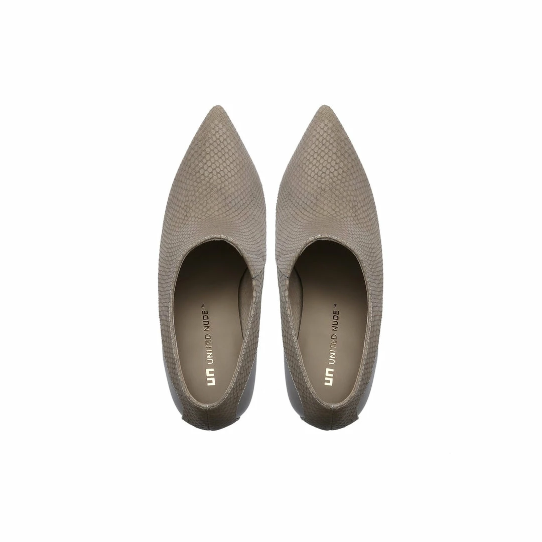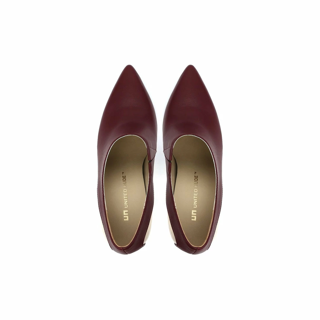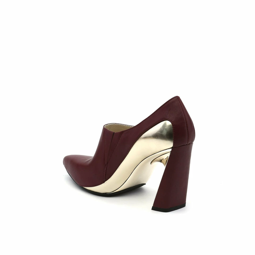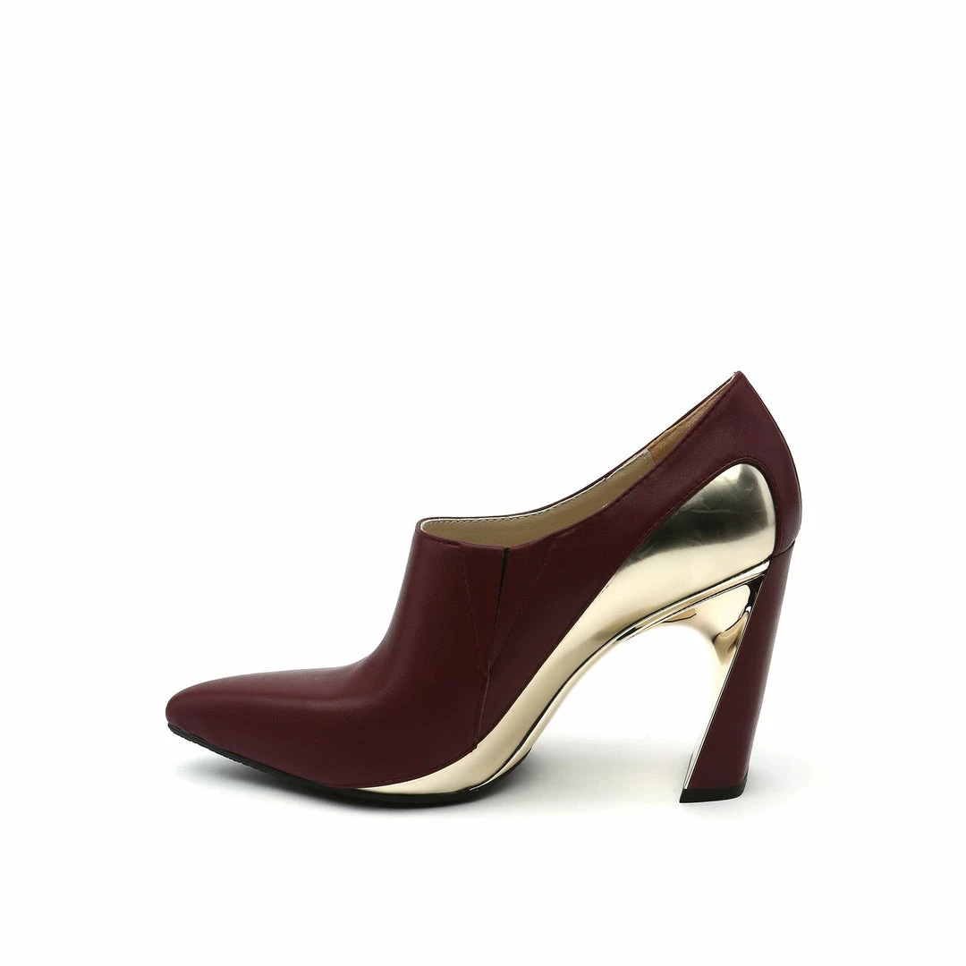 The Molten Flow Bootie Hi is a high heel pointy-toe bootie with a curved top line and semi-chromed heel that seemingly contorts into an arching metallic panel.