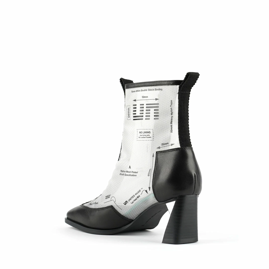 The Rasa Bootie Mid is a mid heel boot with a square toe and a breathable transparent mesh upper framed by leather accents. One side zipper enclosure and two pull tabs offer easy on and off wear. The heat pressed graphics and striking color breaks are inspired by a series of mixed media paintings by United Nude founder and creative director Rem D. Koolhaas.