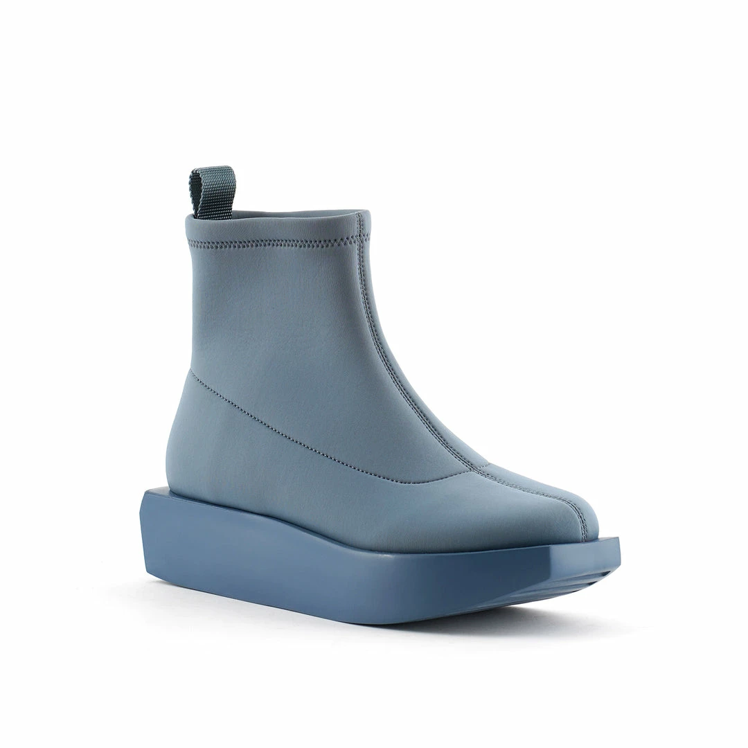 The Wa Bootie Lo features a minimalist sock-like neoprene upper, padded leather insole, and platform rubber wedge.
